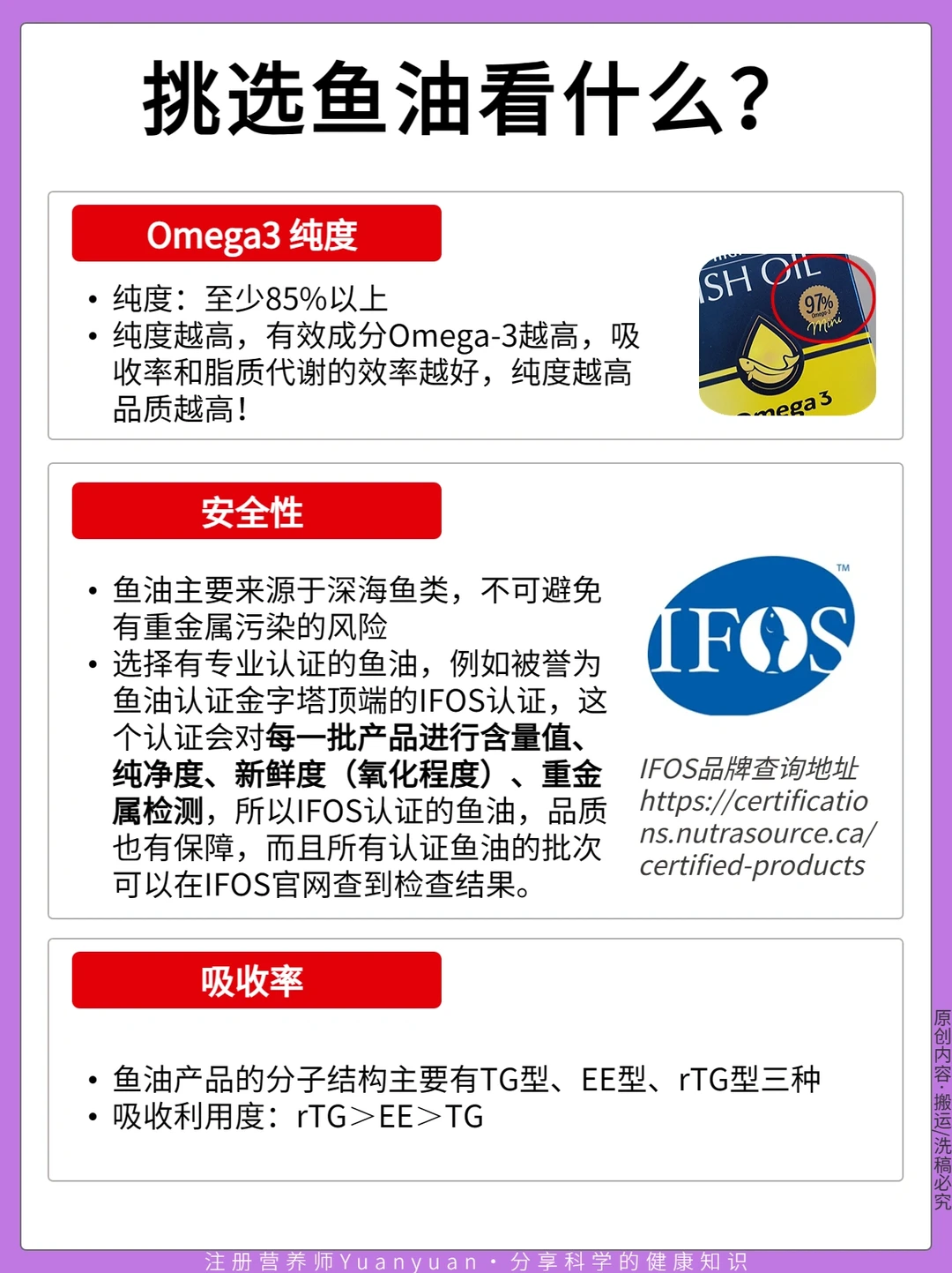 不过选鱼油也是门学问,选不好的话,可能会有重金属污染,里面omega3被氧化,真的是吃了还不如不吃。选鱼油重点要看含量、纯度、安全性和吸收率,具体的看图4。