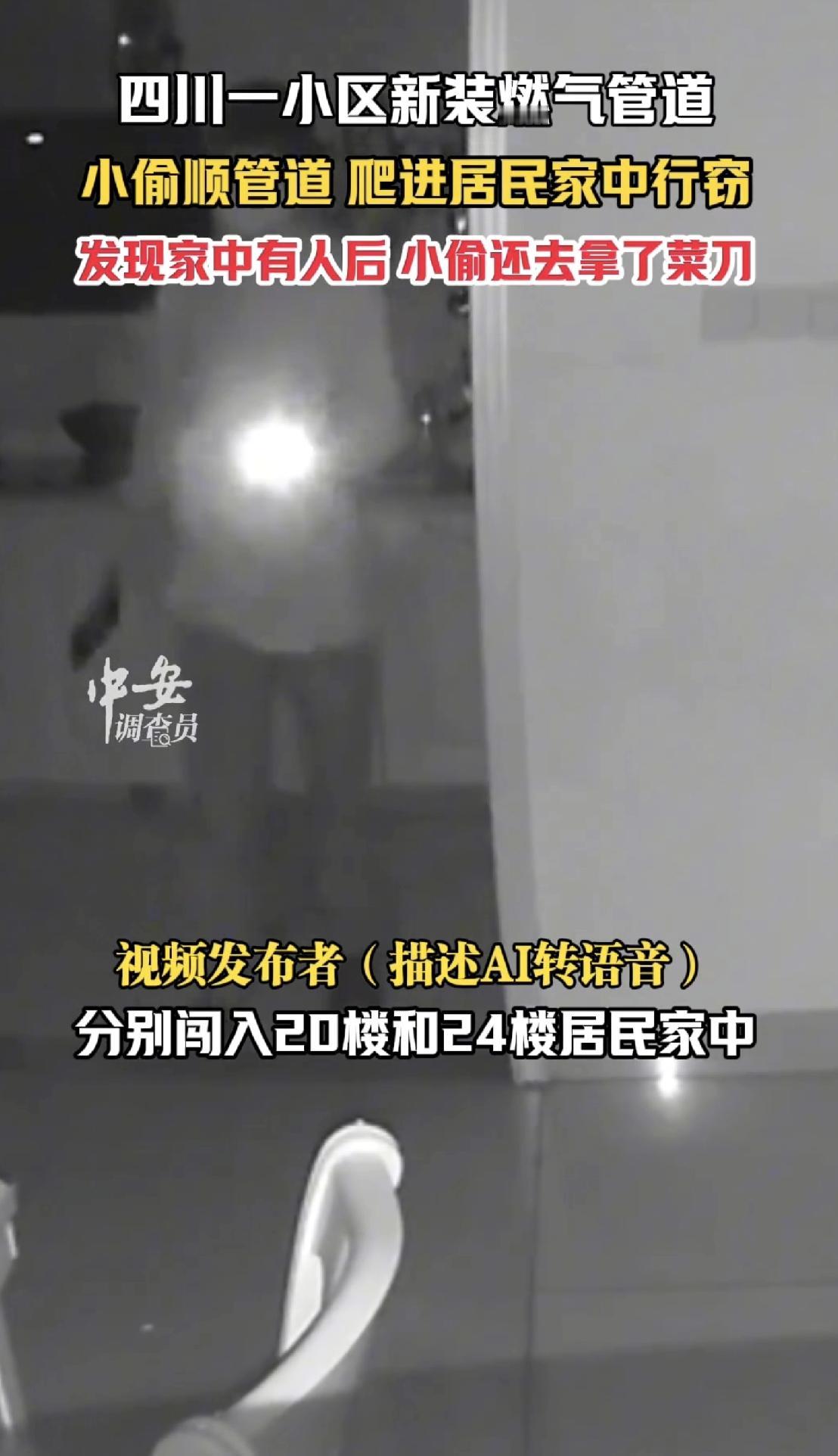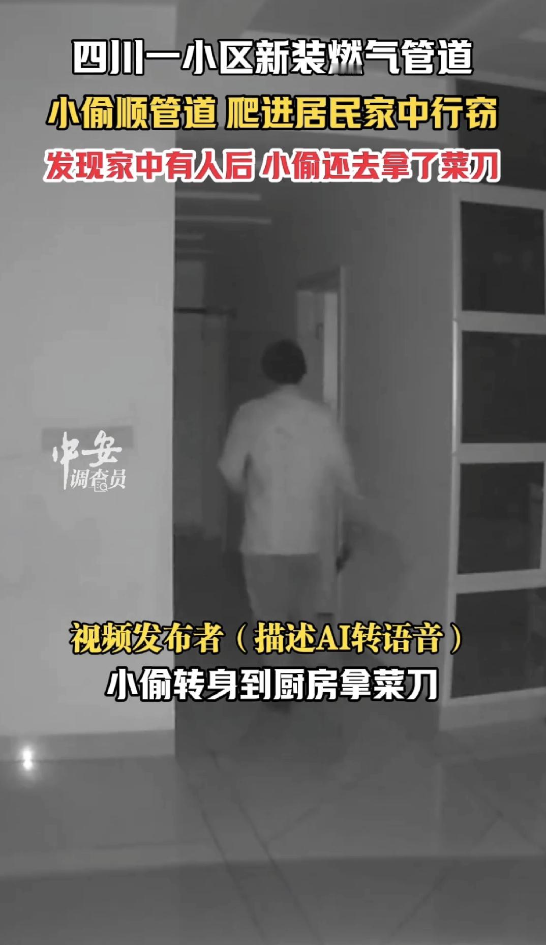 万万没想到!四川宜宾,某小区内,一名小偷竟然顺着新安装的燃气管道爬到20楼和24楼居民家中行窃,发现家中有人后,非但没有收敛,反而还冲进厨房拿了菜刀,后来,听到屋里的人发出声音,又蹑手蹑脚地将菜刀放回去! (来源:中安在线) 11月19日晚上8点多,四川宜宾一个小区里,不少住户都还没睡,没人想到一名小偷正顺着外墙的燃气管道悄悄爬上来。 据了解,这个小区刚装完新的燃气管道,黄色的管道裸露在楼体外,没想到竟给小偷提供了“便利”。 监控镜头清楚拍下了全程:一名男子趁着夜色,手脚并用顺着燃气管道往上爬,动作还挺熟练,一看就是有备而来。 他瞄准高层的住户,爬到窗边后悄悄翻进了屋里,落地时轻手轻脚,生怕发出声音。 进屋后,他先在客厅里摸索着翻找,抽屉、柜子都被他拉开查看,还顺手把几样看着值钱的首饰装进了口袋。 就在他翻得正起劲时,突然听到卧室里传来动静——原来这户人家有人在家休息。 换一般小偷早慌了神赶紧逃跑,可这人非但没跑,反而转身直奔厨房。他打开厨房抽屉,拿出一把菜刀握在手里,然后蹑手蹑脚地朝着卧室走去,想确认屋里到底有几个人。 好在卧室里的人似乎察觉到了异常,轻轻咳嗽了一声,小偷吓得赶紧停下脚步,犹豫了几秒后,把菜刀放回原处,顺着原路爬管道逃走了。 后来小区物业说,当晚不止这一户遭殃,还有另一户业主也被同一个小偷光顾了。 业主们发现被盗后赶紧报警,公安局已经立案调查,不过目前嫌疑人还没被抓到。 现在物业已经联系了天然气公司,准备对裸露的燃气管道进行整改,避免再有人顺着管道爬楼作案。 这事想想就后怕,新装燃气管道本是为了方便居民,却成了安全漏洞。 小偷入室盗窃还敢拿菜刀,已经不只是偷东西那么简单,更是威胁到了居民的生命安全。 我觉得,小区改造基础设施时,不能只考虑功能,安全防护得跟上,比如给外露管道加个防护套或者装些防攀爬装置。物业也得加强巡逻,尤其是晚上,多盯着点外墙和楼道的动静。 另外,居民自己也要提高警惕,睡前检查门窗是否关好,贵重物品妥善存放。只有物业、燃气公司和居民一起留心,才能堵住安全漏洞,让小偷没机会下手,大家住得也才能安心。