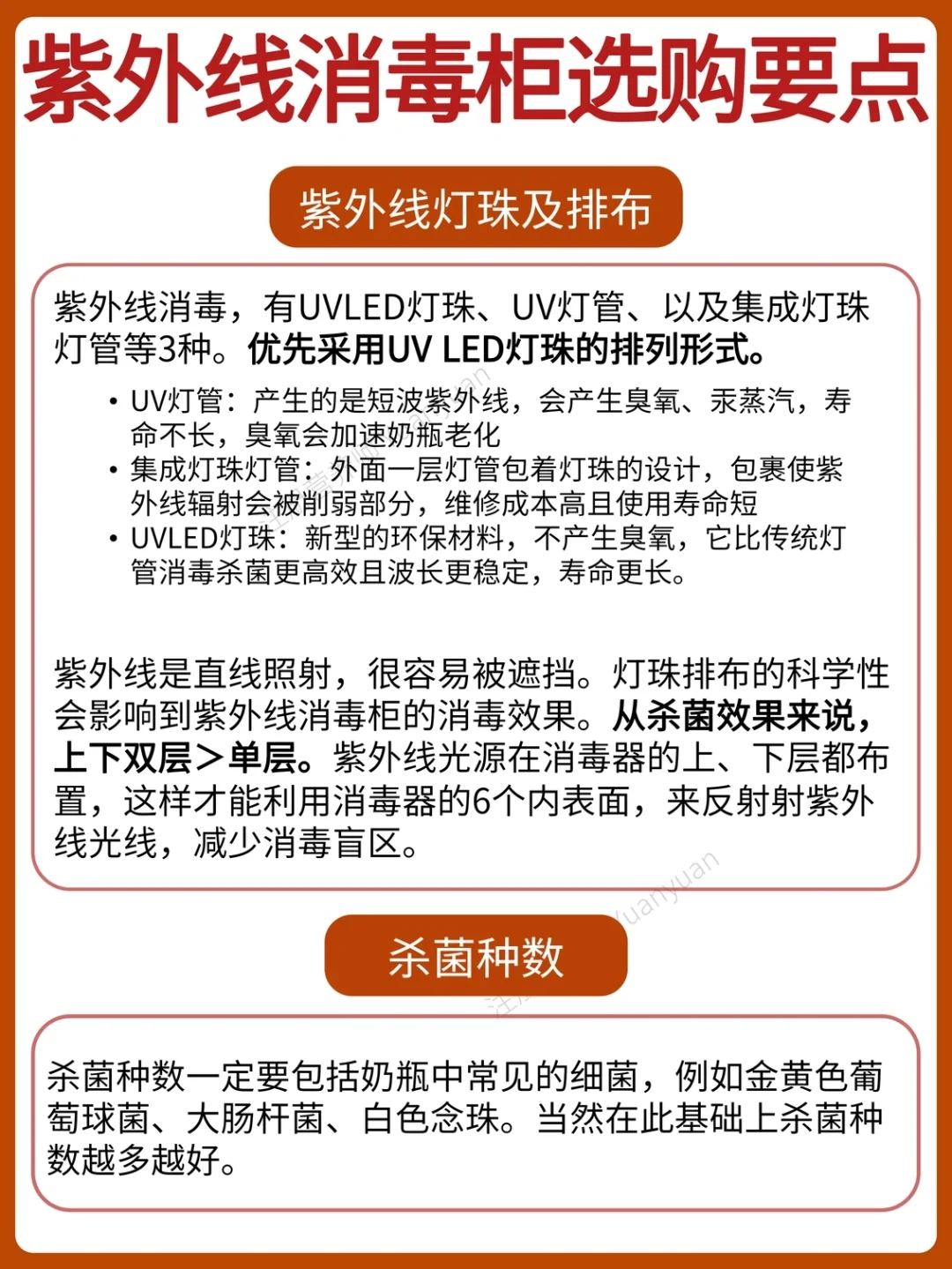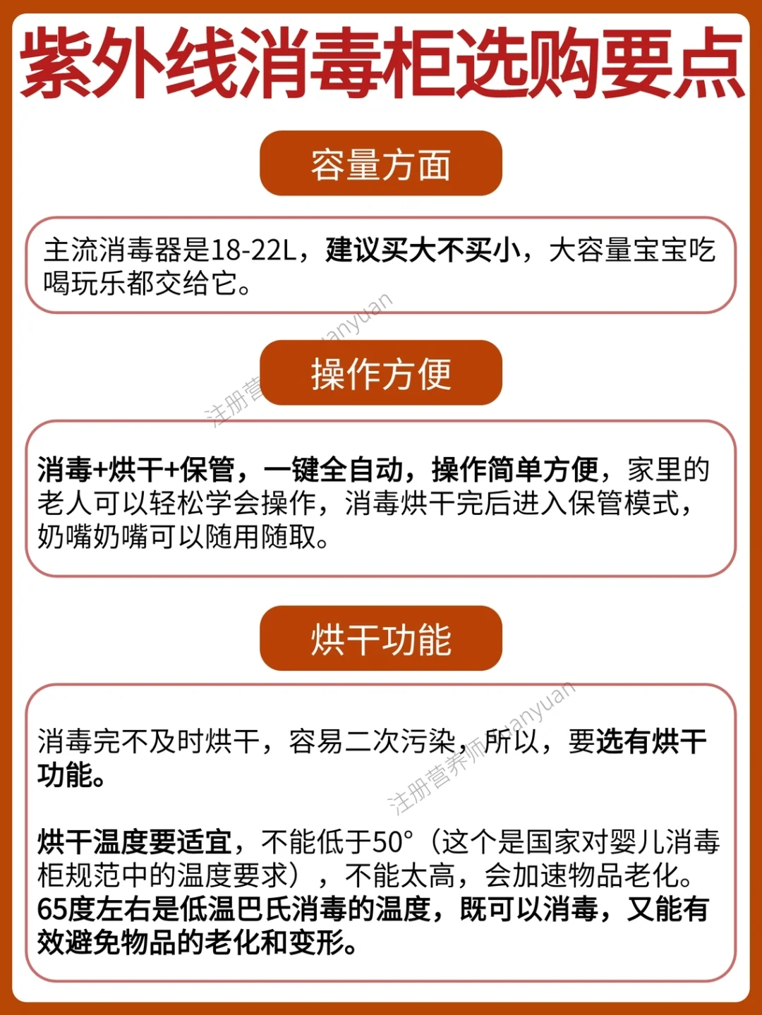 📌紫外线消毒:使用简单方便,不用每次使用加水,可用的范围更广,宝宝的衣物、餐具、不耐高温的玩具等等都可以放进去消毒,宝宝长大了也可以用,不会闲置,价格相对贵一些。