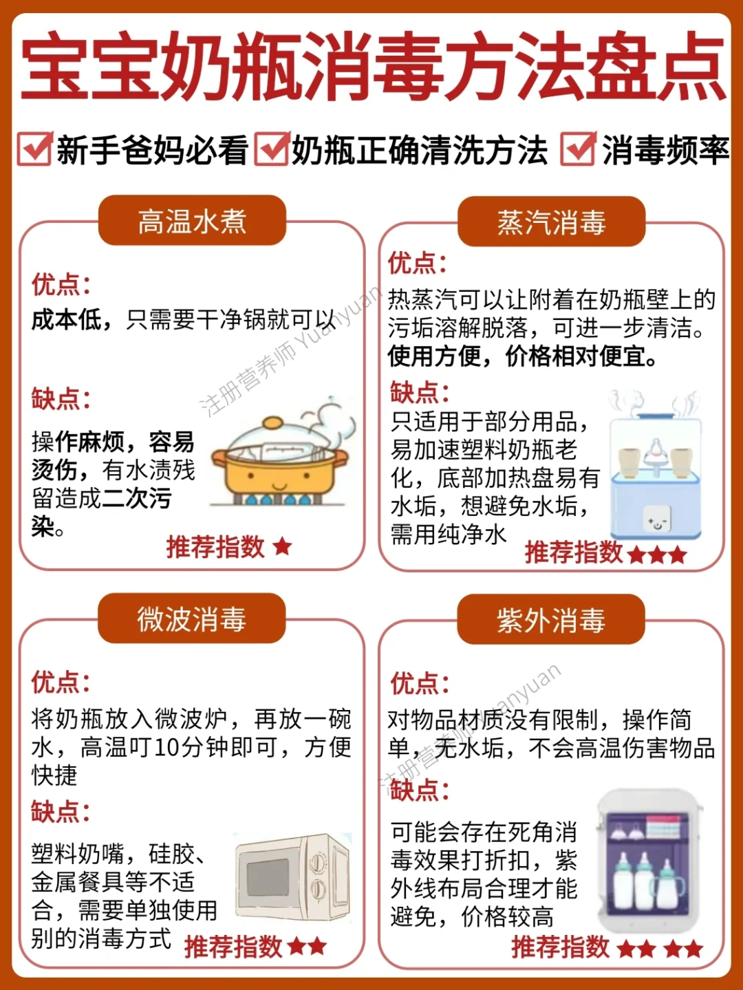 👉日常消毒方式有水煮、微波炉消毒、.蒸汽消毒和紫外线消毒法。四个方法优缺点参考首图。