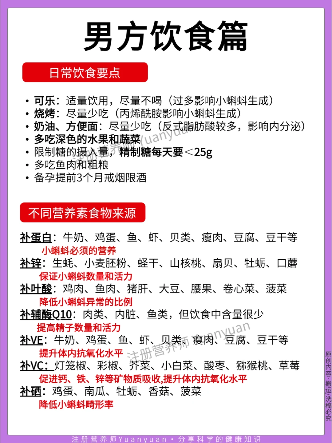 🔅首先,备孕要在饮食上调整,夫妻双方都要注意饮食均衡,营养全面,给卵子和小蝌蚪提供健康成长的必要营。