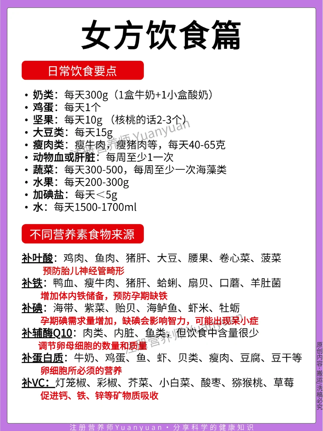🔅对女性比较重要的营养有叶酸、铁、碘、蛋白质、VC、辅酶Q10等,对男生比较重要的营养有蛋白、锌、叶酸、VE、辅酶Q10、VC等,具体的饮食建议详见图2-3。