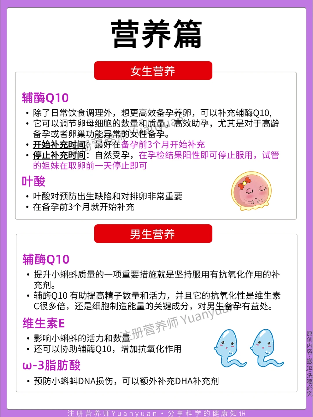 🔅要知道辅酶Q10对高效备孕很好,它能调节卵母细胞的数量和质量,提高小蝌蚪数量和活力。备孕补充辅酶Q10的建议如下: