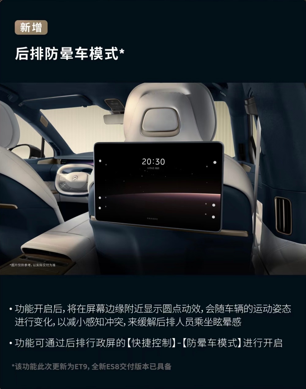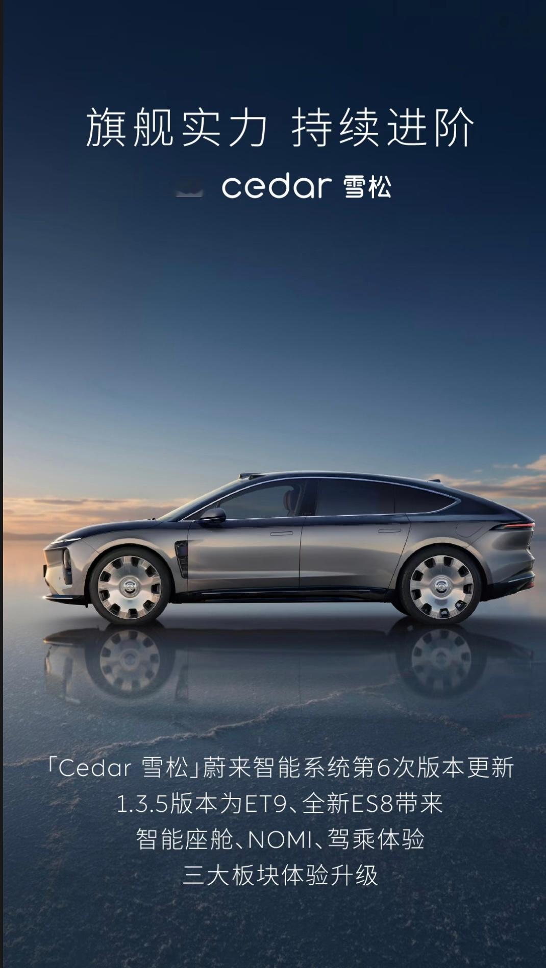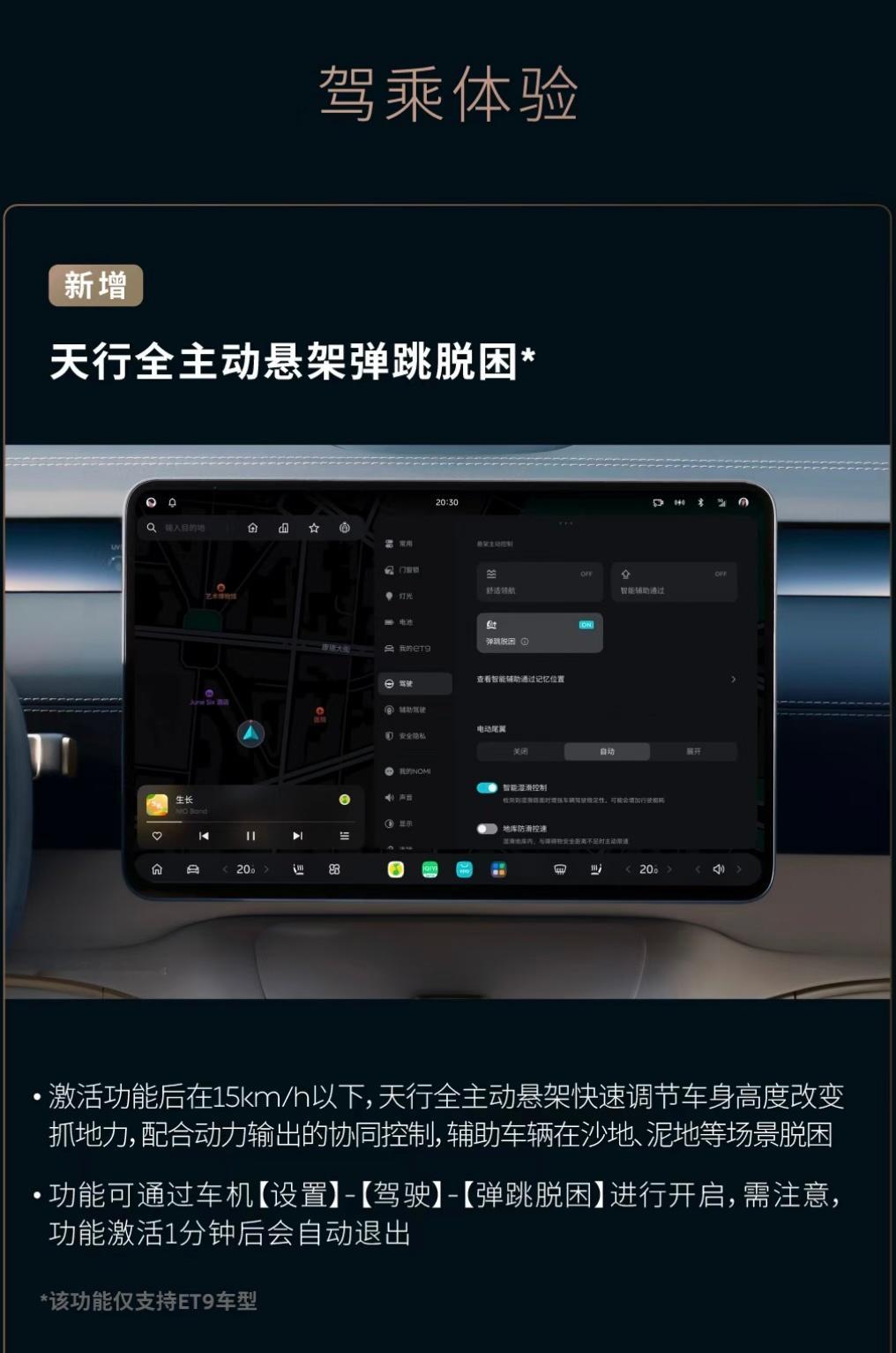 收到了最新 雪松Cedar 1.3.5版本推送更新,有几个新的功能蛮有意思。比如说『后排防晕车模式』,『不开导航也显示红绿灯倒计时』,『iPhone UWB 数字钥匙优化』,『天行全主动悬架弹跳脱困』,等等;防晕车功能不错,得找个容易晕车的朋友到后排试试效果如何蔚来ET9 雪松 Cedar 1.3.5 升级亮点:天行全主动悬架弹跳脱困新增了天行全主动悬架弹跳脱困功能。激活功能后在15km/h以下,天行全主动悬架会利用自身快速调节车身高度的能力,通过车身的上下动作改变车轮抓地力,同时配合动力输出的协同控制,辅助车辆在沙地、泥地等场景下 “挣脱” 困境,顺利驶离。后排防晕车模式新增了后排防晕车模式,功能开启后,将在屏幕边缘附近显示圆点动效,会随车辆的运动姿态进行变化,以减小感知冲突,来缓解后排人员乘坐眩晕感。功能可通过后排行政屏的【快捷控制】-【防晕车模式】进行开启。巡航红绿灯显示新增了巡航红绿灯显示功能,即使不在导航中,也支持在地图上显示邻近路口、多个方向的红绿灯状态和倒计时信息。iPhone数字钥匙优化了iPhone数字钥匙使用体验,开通UWB数字钥匙的iPhone在电量耗尽自然关机后的数小时内,无感解闭锁和启动功能仍可使用,无需再刷NFC,也可解锁开车。智能车控新增了迎宾提示音开关,支持迎宾音效的开启与关闭。功能默认开启,可以通过车机【设置】-【声音】-【迎宾提示音】进行关闭。NOMI AI帽子现已支持NOMI AI帽子全新互动体验。包含糯尔摩斯、饶蛇、领航车手、冠军车手四顶帽子,每一顶NOMI AI帽子都有一段NOMI的特别经历,戴上帽子后,通过智能芯片,NOMI就能解锁有趣的专属登场秀、应答语、趣味表情和特别技能,解锁更多惊喜陪伴。NOMI AI帽子现已上架NIO Life,前往【蔚来 App】-【惊喜】-【运动潮玩】中了解更多关于AI帽子的信息。此次更新也进行了部分体验优化,具体内容如下:- 新增了支持饶蛇AI帽子的导航车标;- 新增禁用后排按键- 新增了AI帽子运营位车机支付卡片;- 优化了衣帽间数字卡片布局,更易理解;- 优化了登场秀的卡片动效,趣味性更强;- 优化了卡片的排序方式,最新佩戴过的帽子最先展示;- 优化了角色扮演及侦探游戏中,更强的上下文理解能力。NOMI进行曲提升了「NOMI 进行曲」等动感的歌曲播放时NOMI一起摇摆动作和歌曲情感的匹配度,可以对NOMI说“我要听NOMI进行曲”,一起来感受魔性的摇摆。NOMI其他新增与优化优化了语音控制遮阳帘、车窗、AR HUD、座椅、空调风向、香氛等功能体验。