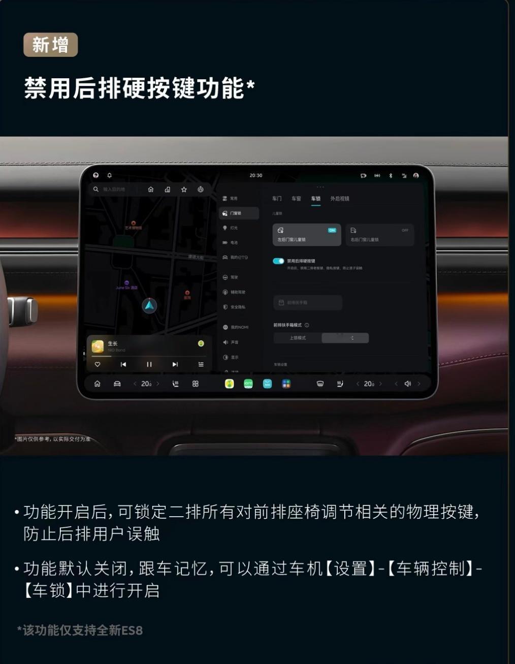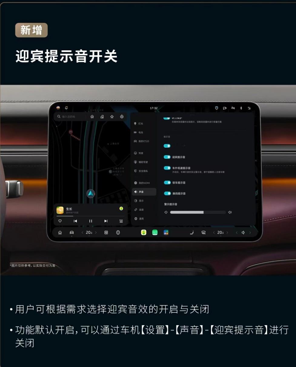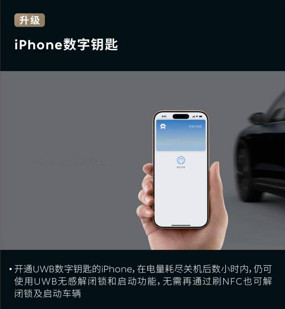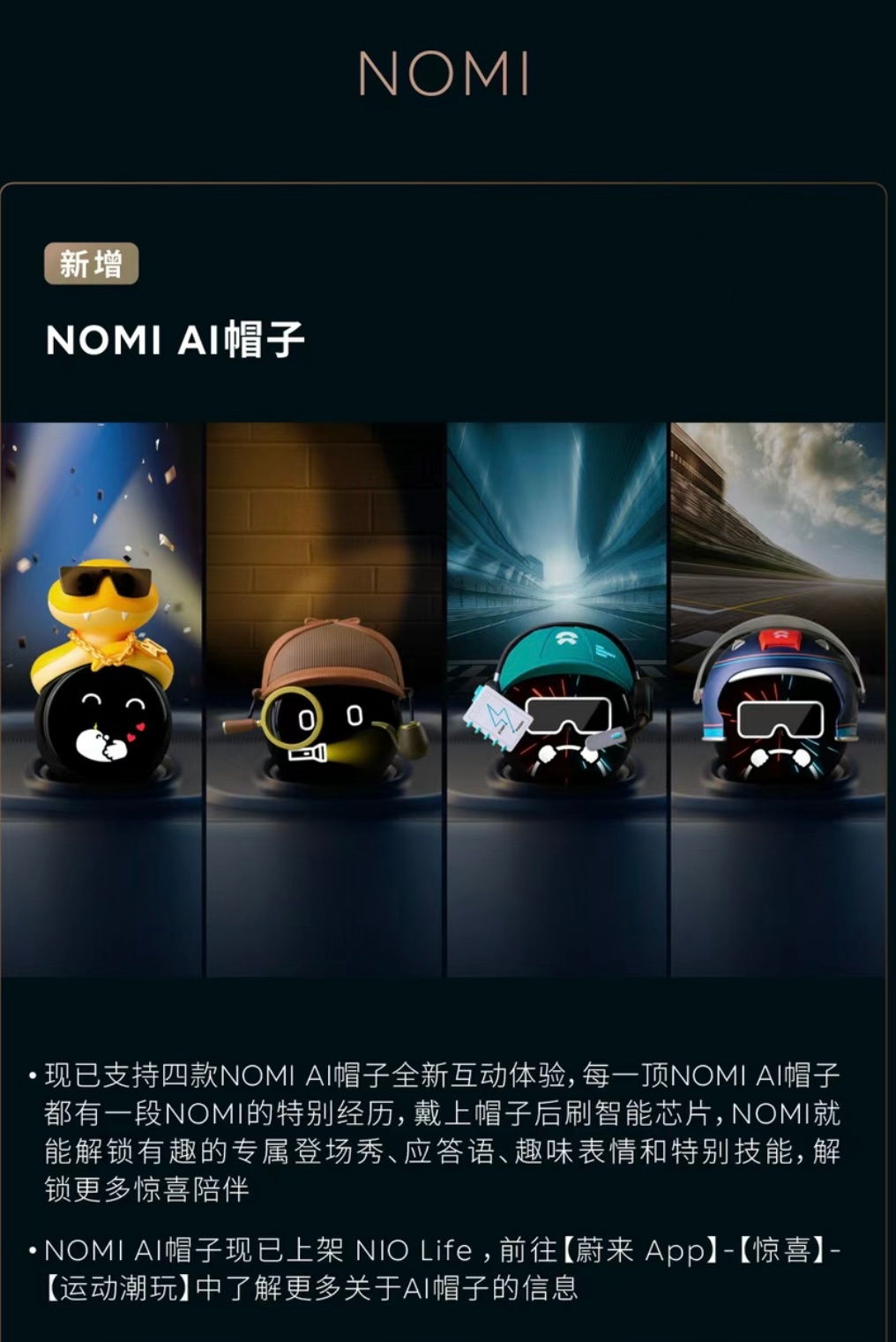 收到了最新 雪松Cedar 1.3.5版本推送更新,有几个新的功能蛮有意思。比如说『后排防晕车模式』,『不开导航也显示红绿灯倒计时』,『iPhone UWB 数字钥匙优化』,『天行全主动悬架弹跳脱困』,等等;防晕车功能不错,得找个容易晕车的朋友到后排试试效果如何蔚来ET9 雪松 Cedar 1.3.5 升级亮点:天行全主动悬架弹跳脱困新增了天行全主动悬架弹跳脱困功能。激活功能后在15km/h以下,天行全主动悬架会利用自身快速调节车身高度的能力,通过车身的上下动作改变车轮抓地力,同时配合动力输出的协同控制,辅助车辆在沙地、泥地等场景下 “挣脱” 困境,顺利驶离。后排防晕车模式新增了后排防晕车模式,功能开启后,将在屏幕边缘附近显示圆点动效,会随车辆的运动姿态进行变化,以减小感知冲突,来缓解后排人员乘坐眩晕感。功能可通过后排行政屏的【快捷控制】-【防晕车模式】进行开启。巡航红绿灯显示新增了巡航红绿灯显示功能,即使不在导航中,也支持在地图上显示邻近路口、多个方向的红绿灯状态和倒计时信息。iPhone数字钥匙优化了iPhone数字钥匙使用体验,开通UWB数字钥匙的iPhone在电量耗尽自然关机后的数小时内,无感解闭锁和启动功能仍可使用,无需再刷NFC,也可解锁开车。智能车控新增了迎宾提示音开关,支持迎宾音效的开启与关闭。功能默认开启,可以通过车机【设置】-【声音】-【迎宾提示音】进行关闭。NOMI AI帽子现已支持NOMI AI帽子全新互动体验。包含糯尔摩斯、饶蛇、领航车手、冠军车手四顶帽子,每一顶NOMI AI帽子都有一段NOMI的特别经历,戴上帽子后,通过智能芯片,NOMI就能解锁有趣的专属登场秀、应答语、趣味表情和特别技能,解锁更多惊喜陪伴。NOMI AI帽子现已上架NIO Life,前往【蔚来 App】-【惊喜】-【运动潮玩】中了解更多关于AI帽子的信息。此次更新也进行了部分体验优化,具体内容如下:- 新增了支持饶蛇AI帽子的导航车标;- 新增禁用后排按键- 新增了AI帽子运营位车机支付卡片;- 优化了衣帽间数字卡片布局,更易理解;- 优化了登场秀的卡片动效,趣味性更强;- 优化了卡片的排序方式,最新佩戴过的帽子最先展示;- 优化了角色扮演及侦探游戏中,更强的上下文理解能力。NOMI进行曲提升了「NOMI 进行曲」等动感的歌曲播放时NOMI一起摇摆动作和歌曲情感的匹配度,可以对NOMI说“我要听NOMI进行曲”,一起来感受魔性的摇摆。NOMI其他新增与优化优化了语音控制遮阳帘、车窗、AR HUD、座椅、空调风向、香氛等功能体验。