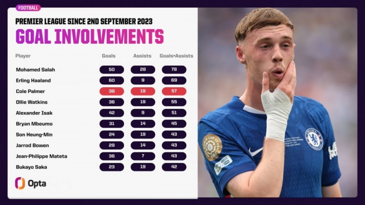 直播吧11月21日讯切尔西主帅马雷斯卡确认帕尔默因意外受伤将再次推迟复出,opta数据统计显示他对切尔西无比重要。自他为切尔西首秀以来共计在英超直接参与57球,同期仅次于萨拉赫和哈兰德。
