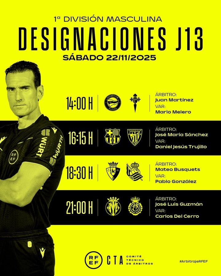 直播吧11月21日讯西班牙足协今天公布了周六(含周日凌晨)西甲四场比赛的裁判名单,具体如下:
