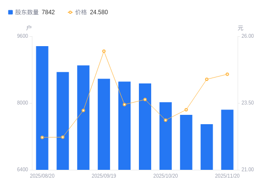 日期A股户数(户)流通A股户均持股数(股)户均持股市值(万元)2025-11-20784217816.6343.792025-11-10749518641.4945.472025-10-31771918100.5342.082025-10-20802017421.1939.822025-10-10847216491.7438.982025-09-30851416410.3838.472025-09-19858116339.8141.582025-09-10890315748.8336.582025-08-29874416035.2135.642025-08-20936414973.5033.26