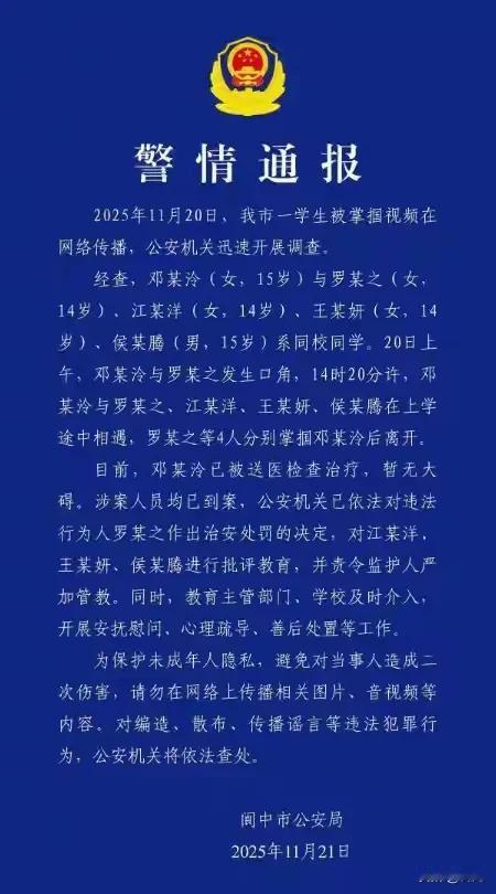 校园欺凌只批评教育是太轻了吗? 四川省阆中市公安局11月21日发布警情通报:2025年11月20日,阆中市15岁女学生在上学路上被四名同学掌掴视频在网络传播。 公安机关迅速开展调查最后处理:对当事三人予以批评教育、一人进行治安处罚的处理结果。 这四名同学在公共场合掌掴他人,这次批评教育能起到震慑作用吗?令人担忧。 这件事家长、老师、学校都有责任,教育不到位,受害女孩心理留下阴影。 孩子在成长中难免犯错误,怎样杜绝欺凌霸凌,值得研究这个课题。
