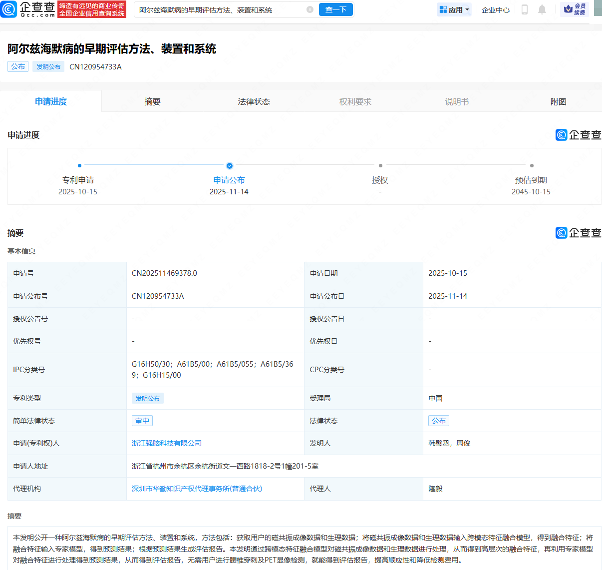 企查查APP显示,近日,浙江强脑科技有限公司申请公布阿尔兹海默病的早期评估方法、装置和系统相关专利。