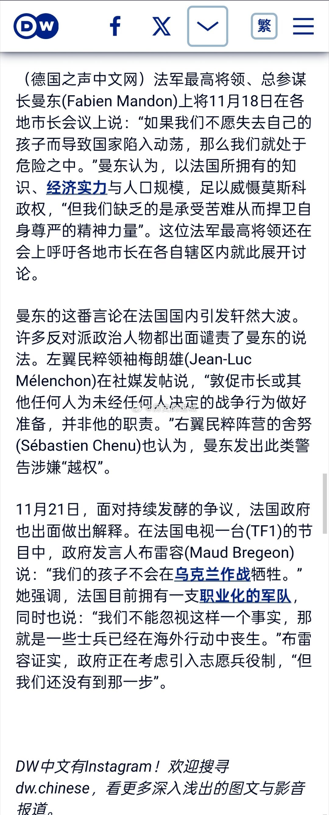 乳髮段子又多了一个,法军最高将领、总参谋长曼东上将本想强行装x一波,结果把法国国内吓坏了,左右一起谴责曼东。曼东11月18日在各地市长会议上说:“如果我们不愿失去自己的孩子而导致国家陷入动荡,那么我们就处于危险之中。”曼东认为,以法国所拥有的知识、经济实力与人口规模,足以威慑莫斯科,“但我们缺乏的是承受苦难从而捍卫自身尊严的精神力量”。这位法军最高将领还在会上呼吁各地市长在各自辖区内就此展开讨论。曼东的这番言论在法国国内引发轩然大波。许多反对派政治人物都出面谴责了曼东的说法。左翼民粹领袖梅朗雄在社媒发帖说,“敦促市长或其他任何人为未经任何人决定的战争行为做好准备,并非他的职责。”右翼民粹阵营的舍努也认为,曼东发出此类警告涉嫌“越权”。11月21日,面对持续发酵的争议,法国政府也出面做出解释。在法国电视一台的节目中,政府发言人布雷容说:“我们的孩子不会在乌克兰作战牺牲。”她强调,法国目前拥有一支职业化的军队,同时也说:“我们不能忽视这样一个事实,那就是一些士兵已经在海外行动中丧生。”布雷容证实,政府正在考虑引入志愿兵役制,“但我们还没有到那一步”。