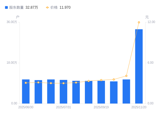 日期A股户数(户)流通A股户均持股数(股)户均持股市值(万元)2025-11-203286635826.926.972025-10-2010639118000.517.342025-09-309790319561.126.942025-09-1910064319028.576.562025-09-1010018819114.996.352025-08-2010063319030.465.882025-07-3110468318294.215.472025-07-1810645217990.205.402025-07-1010354318495.625.752025-06-3010662117961.685.48