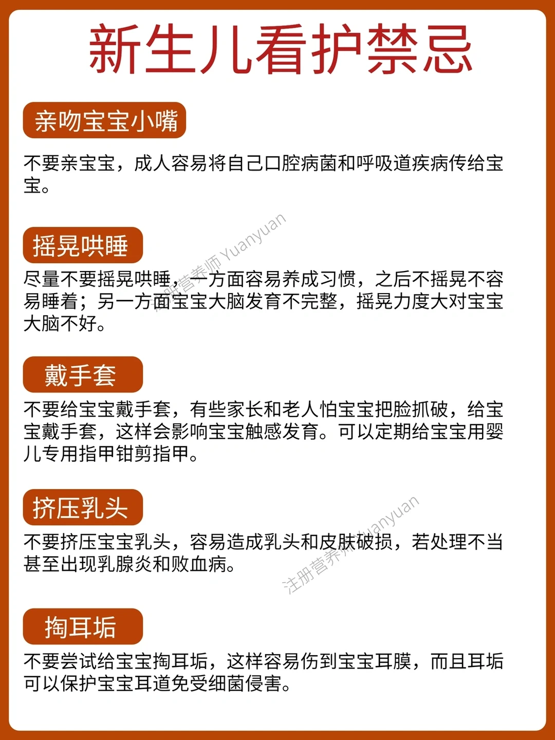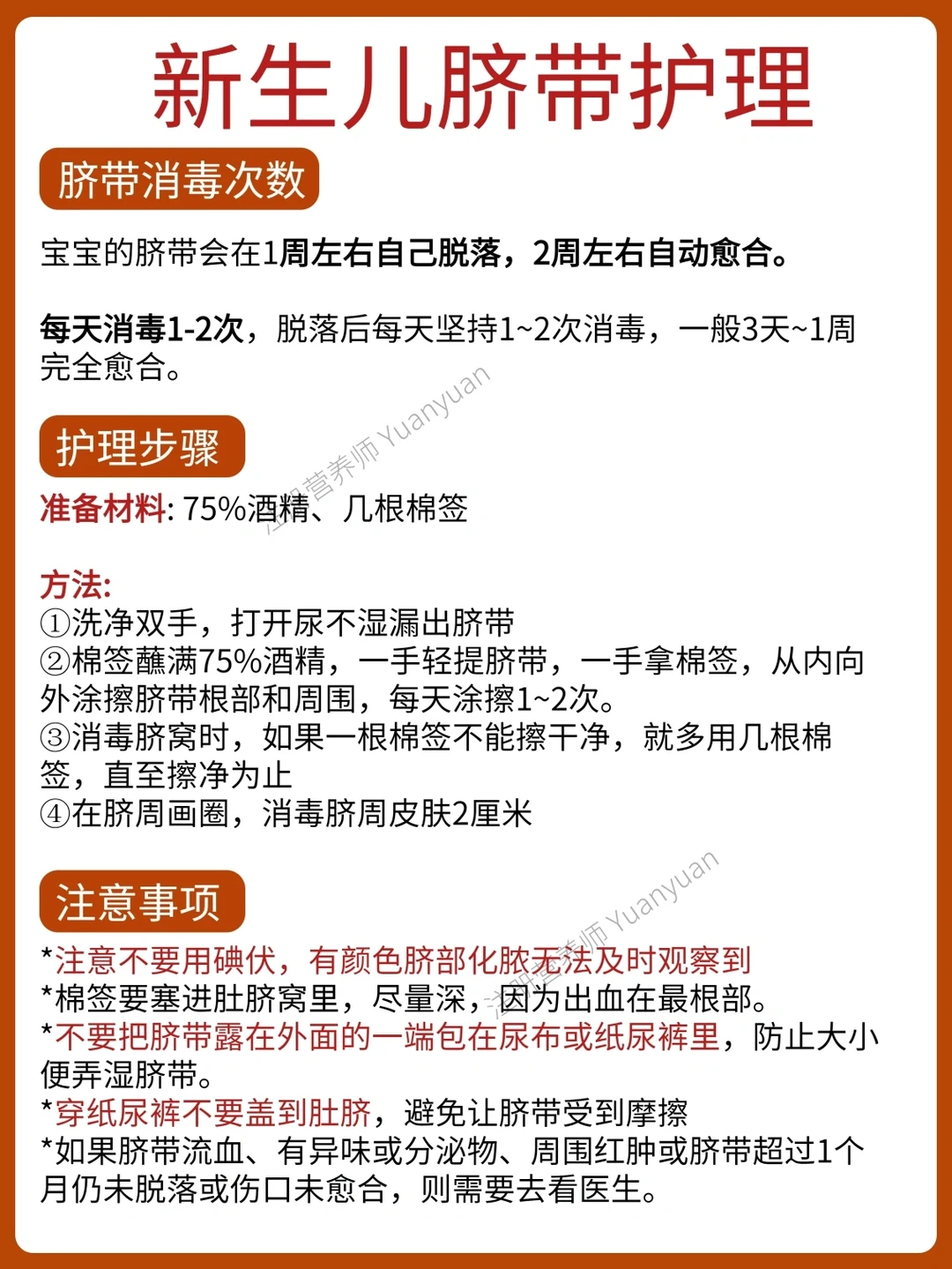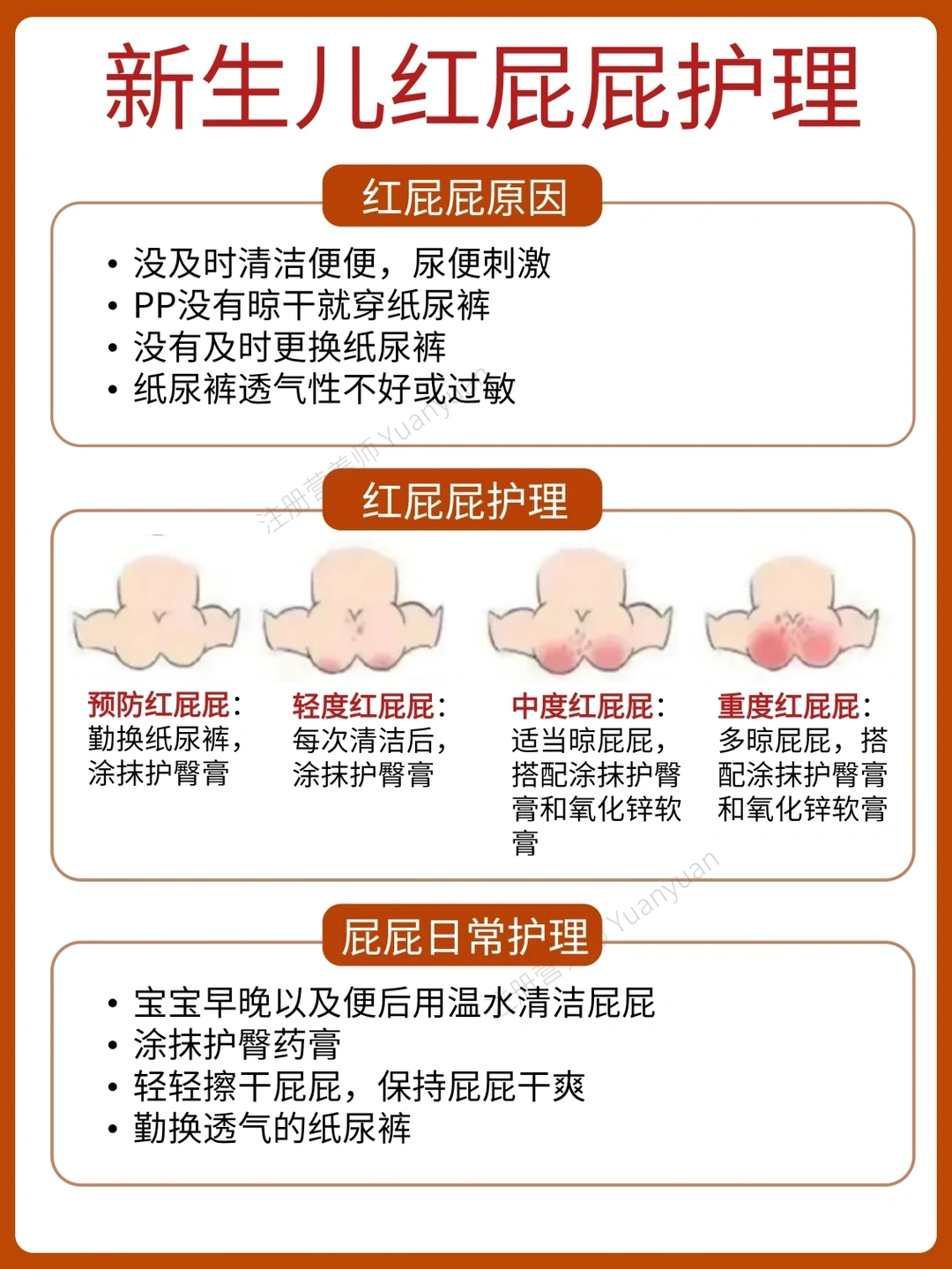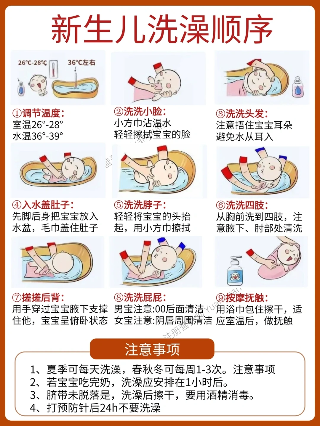 新生儿护理对于新手爸妈十分陌生。总结了常见的新生儿护理,分享给大家 1⃣脐带护理 2⃣红屁屁护理 3⃣洗澡顺序 4⃣看护禁忌