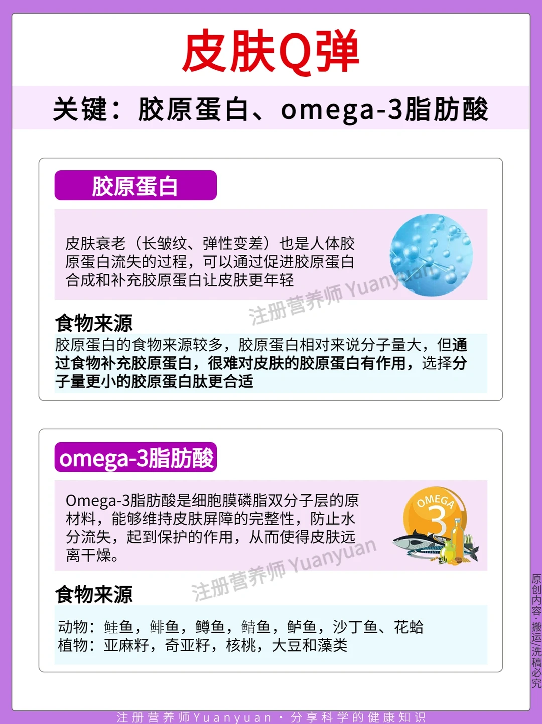提到的营养中胶原蛋白比较特殊,虽然含胶原蛋白的食物有很多,但是由于胶原蛋白分子量大,通过食物补充胶原蛋白,很难被转化吸收到皮肤,选择分子量更小的胶原蛋白肽会更合适。