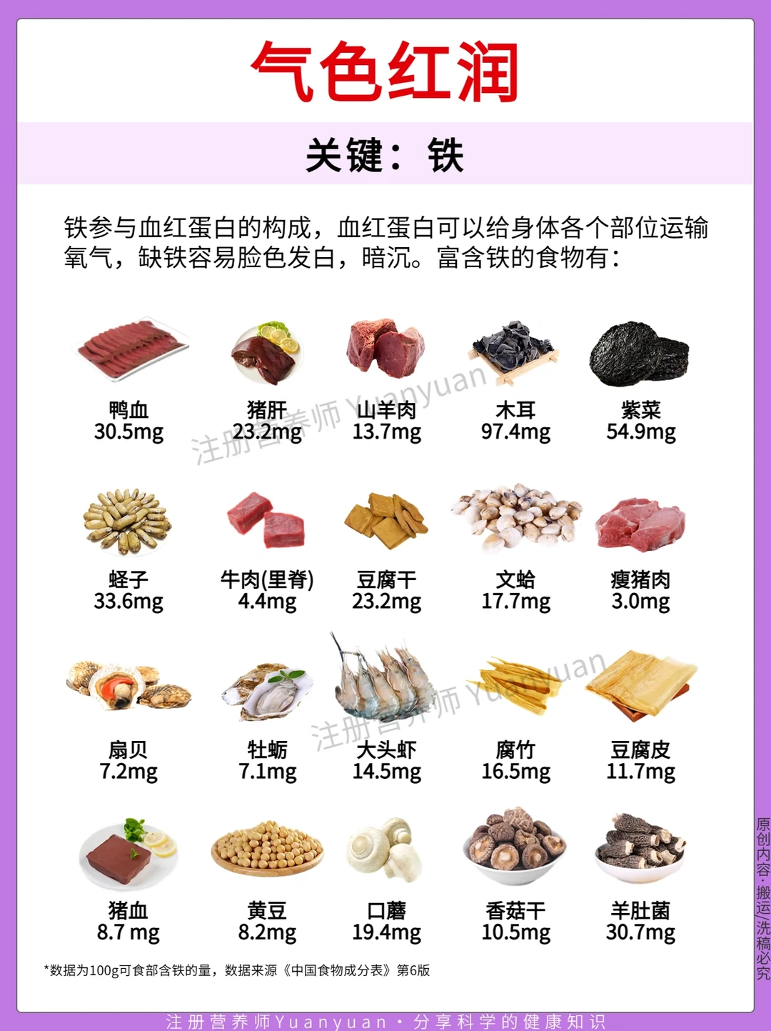 上面说到的很多营养,通过食物就可以补充,给各位爱美姐妹们整理了各个营养素对应的食物,大家可以在图2-6中查看。
