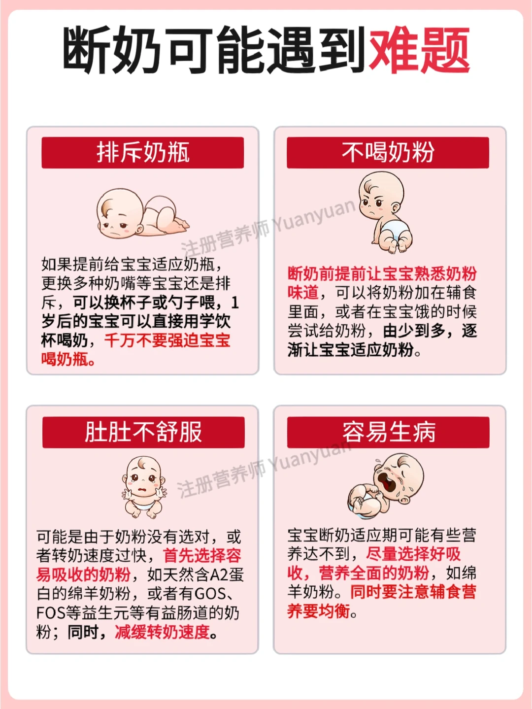 🔺喝奶粉后肚肚不舒服,容易生病→选择合适奶粉,同时减缓转奶速度。