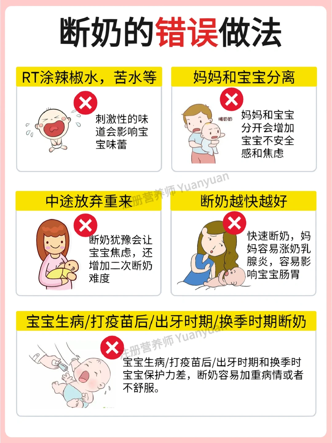 宝宝断奶,是所有母乳妈妈要经历的事情。家人们为了断奶成功会提出很多建议,比方说,RT涂抹辣椒水,强行隔离断奶等,但是这些方法真的对宝宝和妈妈都不好。今天根据自己的成功断奶经验整理了一份科学断奶攻略,希望对各位妈妈们有帮助。