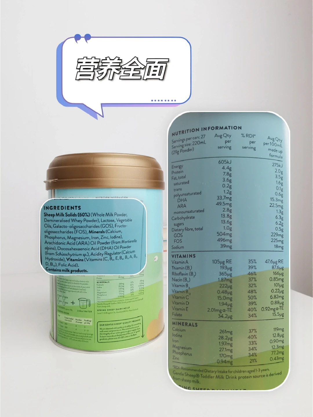 选择这款奶粉是因为它是绵羊奶粉,是天然小分子结构很好消化,对宝宝肚肚更友好✌。而且是天然A2类奶源,还能避免牛奶不耐受的问题出现。大家记得看奶粉主要还是要看奶源和配方,这个奶源是新西兰的牧草喂养的绵羊,里面的中链脂肪酸和共辄亚油酸对比饲料喂养的更高。配方上还添加了GOS+FOS益生元组合,维护宝宝肠道健康👍。最开始我还担心羊奶粉有膻味,宝宝不喜欢,后来拿到手冲泡的时候才知道我多虑了,只是淡淡的奶香味,宝宝很爱喝👏,断奶期间小肚肚不闹脾气,每天吃得饱睡得香!