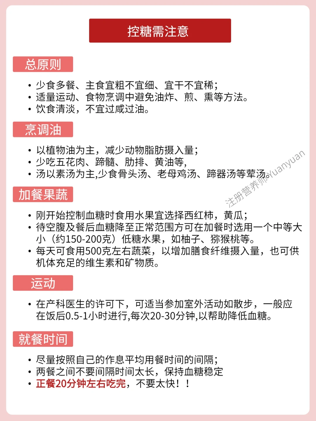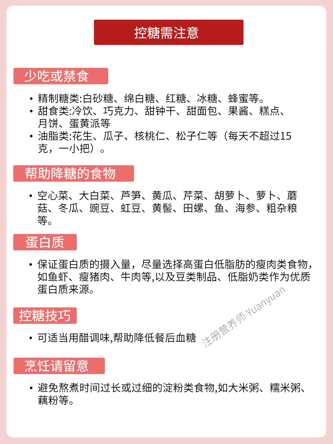 🔺控糖总原则:少食多餐、主食宜粗不宜细、宜干不宜稀:适量运动、食物烹调中避免油炸、煎、熏等方法。饮食清淡,不宜过咸过油。
