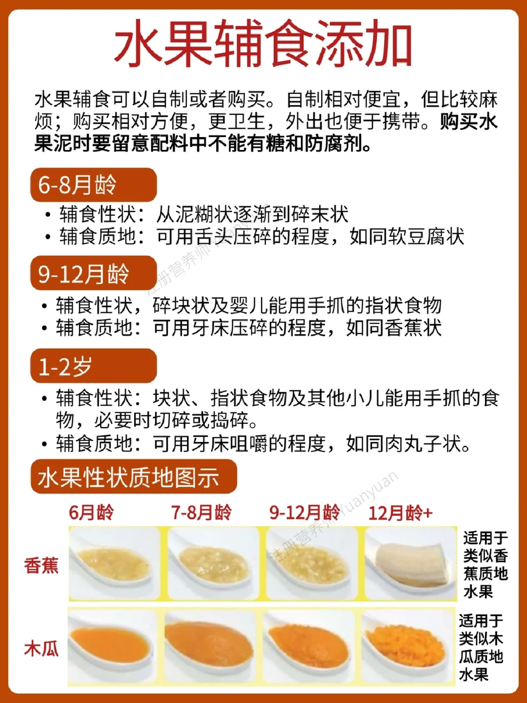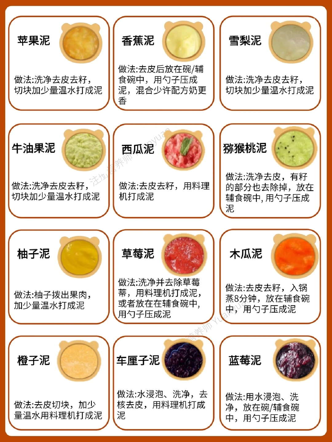 笔记中有12种常见水果泥的制作方法,总的来说,软一些的水果可以用勺子刮或者碾碎吃,质地硬一些的辅食机加水打成泥,具体的做法详见图2。