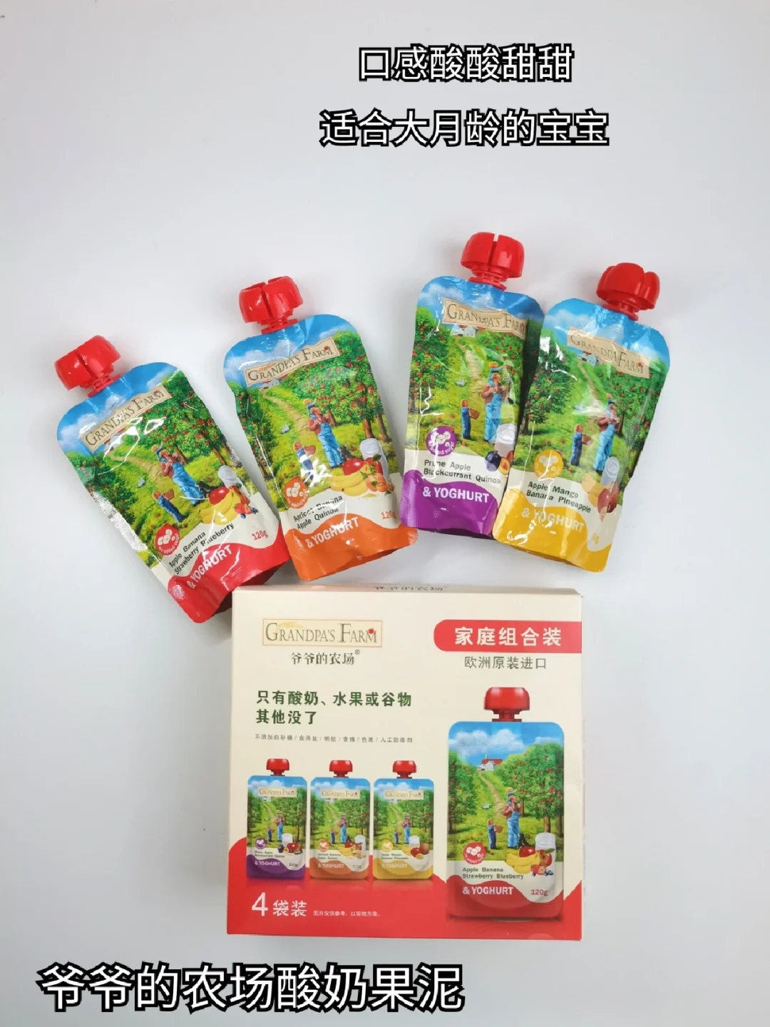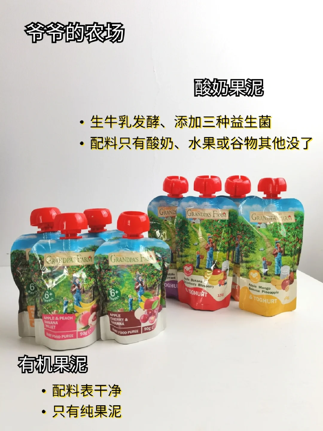 我家宝宝吃的是爷爷的农场果泥,小月龄吃的是有机果泥,配料表干净,只有纯水果,口感酸酸甜甜,宝宝爱吃,外出携带方便。后来宝宝月龄大了,可以吃酸奶果泥,这款是用生牛乳发酵,添加了3种益生菌,配料也只有水果或谷物,酸奶,都是小袋包装,出门带着就很方便~