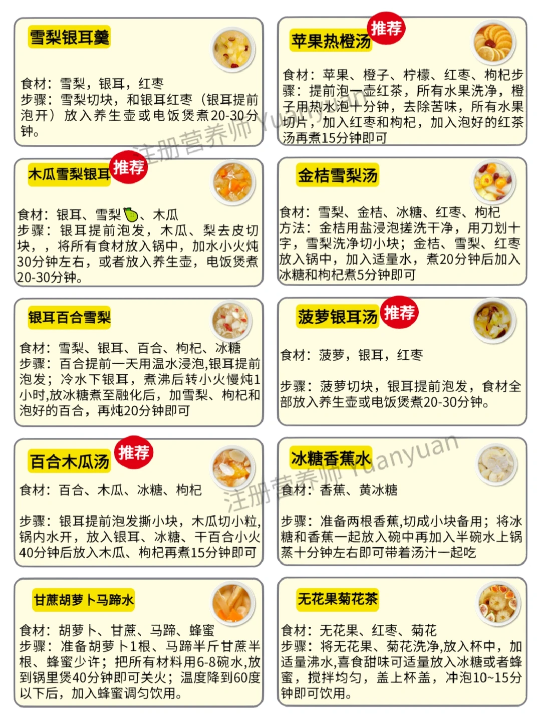 👉如果冬季嫌水果凉也可以做水果甜汤,给大家准备了十几种水果甜汤做法和作用(图1-2),可以全家一起喝起来~