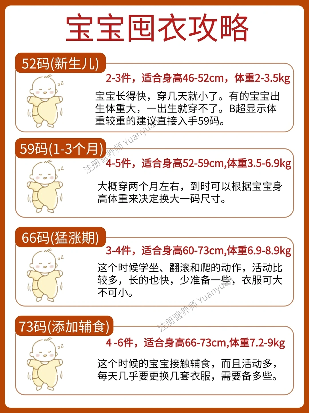 很多新手爸妈不知道新生儿衣服怎么选,囤多少?要不要一次性囤购。通过查阅资料也根据自己的经验,总结了一些内容,可详见图文。 ⭐️重点建议,衣服只买最近穿合适,和马上就要能穿的,不要提前很久囤货,宝宝长的快,提早囤会浪费很多。