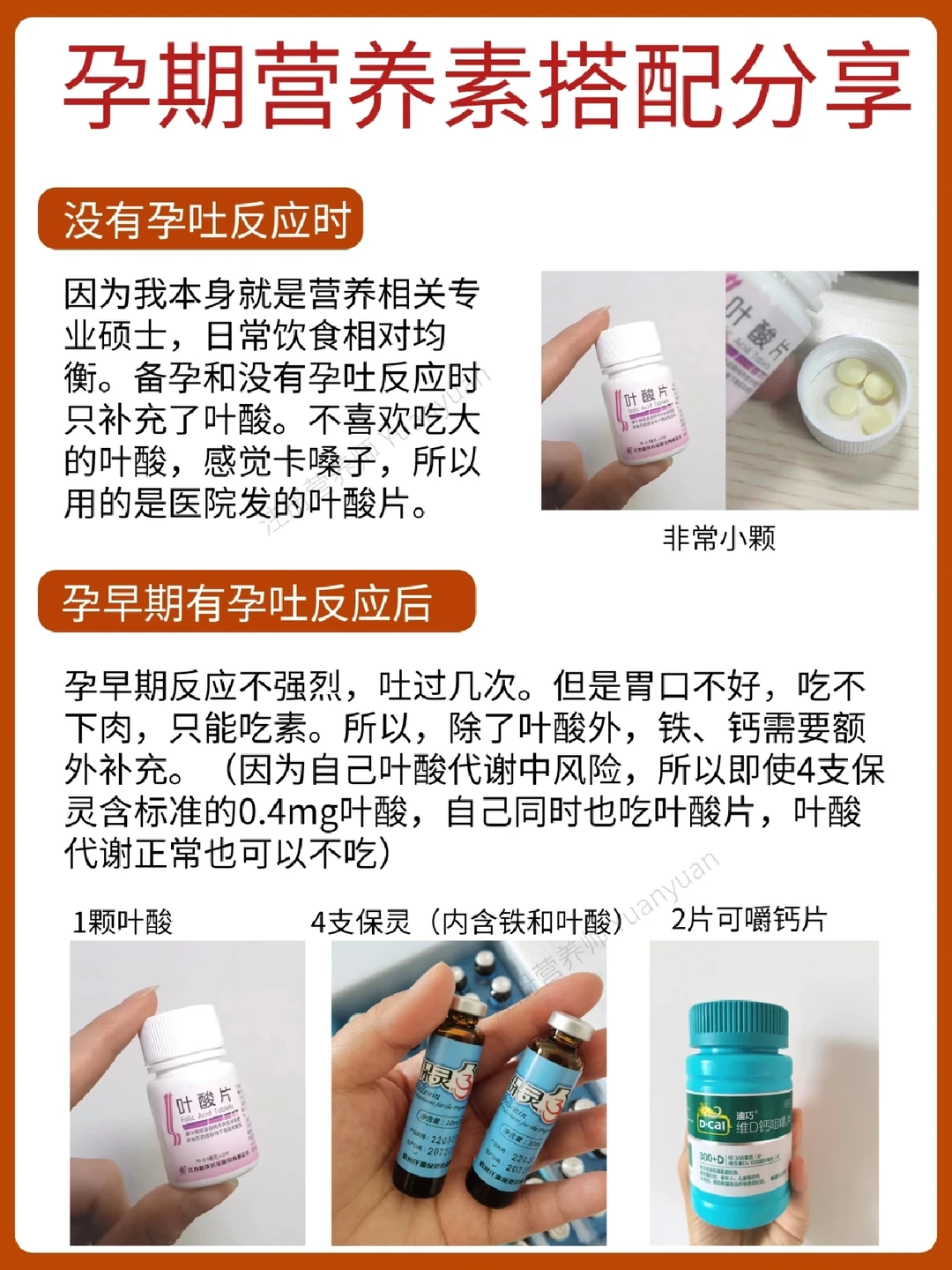 ⭐️提示:孕吐影响进食,或者吐的多时要及时服用营养素,避免营养摄入不足。笔记末页分享了自己孕期营养素补充组合和思路,大家可以根据自己的情况选择合适的补充剂。