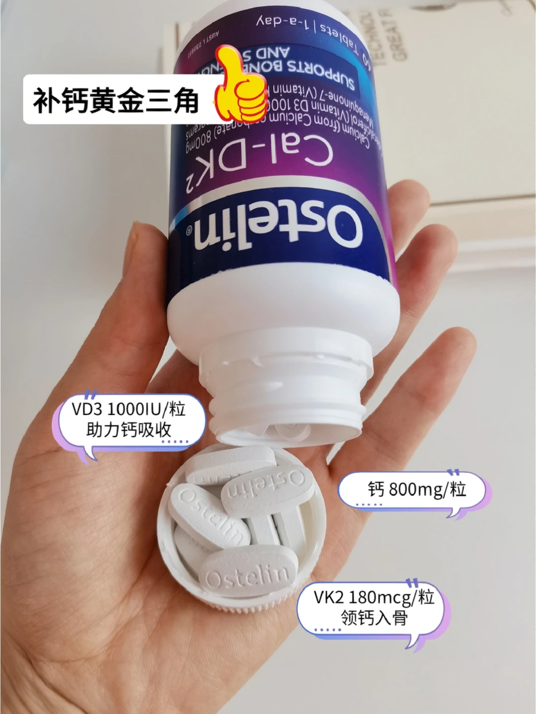 像我这样的外卖党单靠饮食没法摄入足量的钙,就得依靠外源性钙补充剂。我日常吃的Ostelin奥斯特林DK2钙片,每天1粒,富含800mg钙,相当于喝3-4盒牛奶,里面还有1000IU的VD3以及180mcg的VK2,能够和钙组成黄金补钙三角👏,搭配饮食满足每日钙摄入所需。