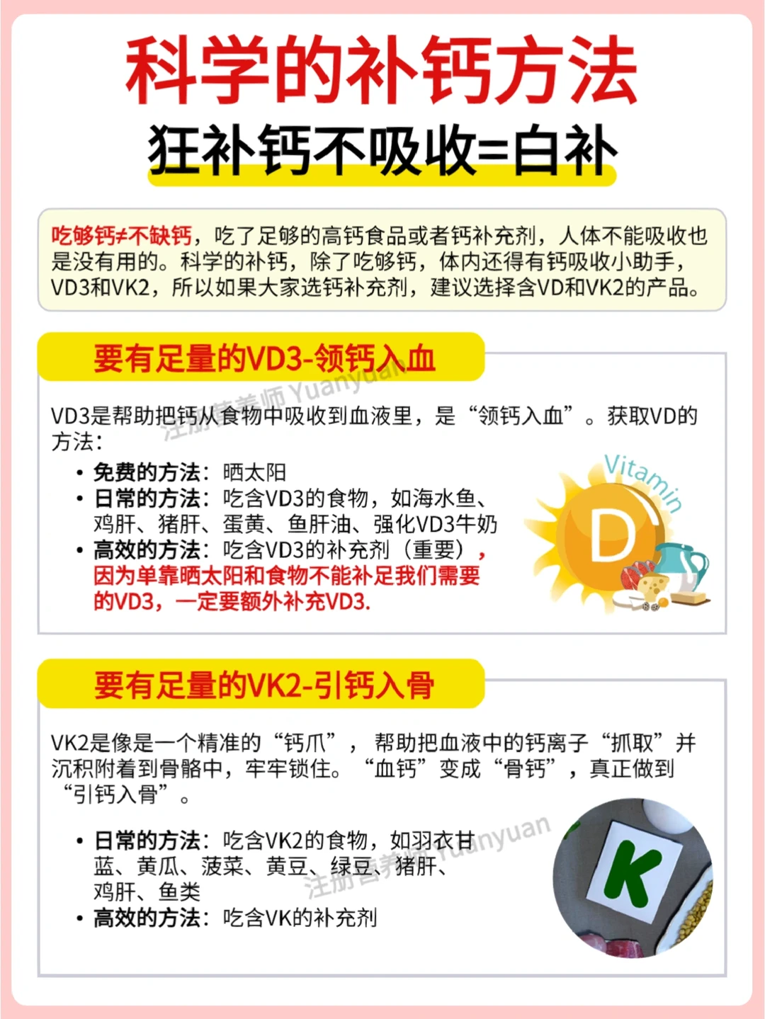 🔅其次不能单独“补钙”,要搭配辅助钙吸收的营养成分,比如“VD3”和“VK2”。