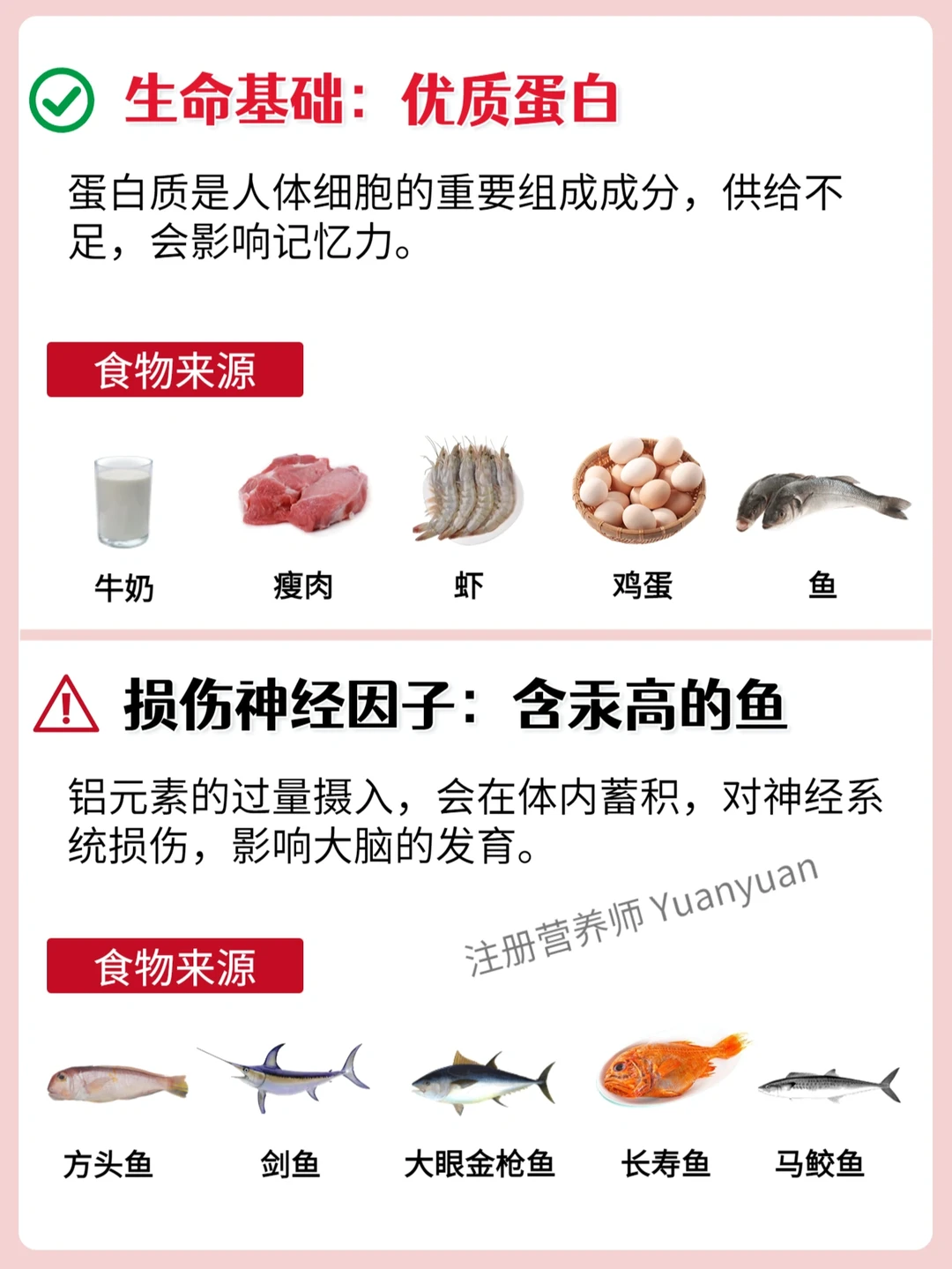 🔺损伤神经因子:含汞高的鱼。食物来源:方头鱼、剑鱼、马鲛鱼等。