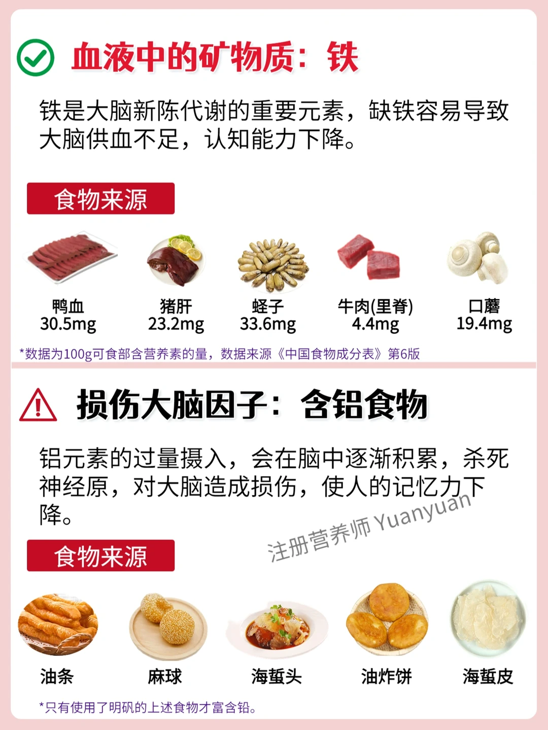 🔺损伤大脑因子:含铝食物。食物来源: 油条、麻球、油炸葱花饼、炸油饼、海蜇头、盐渍海蜇皮。