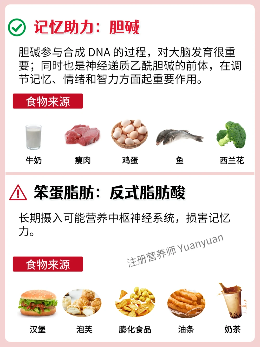 🔺记忆助力:胆碱。食物来源:鱼、畜禽肉、鸡蛋、牛奶、西兰花、蚕豆。