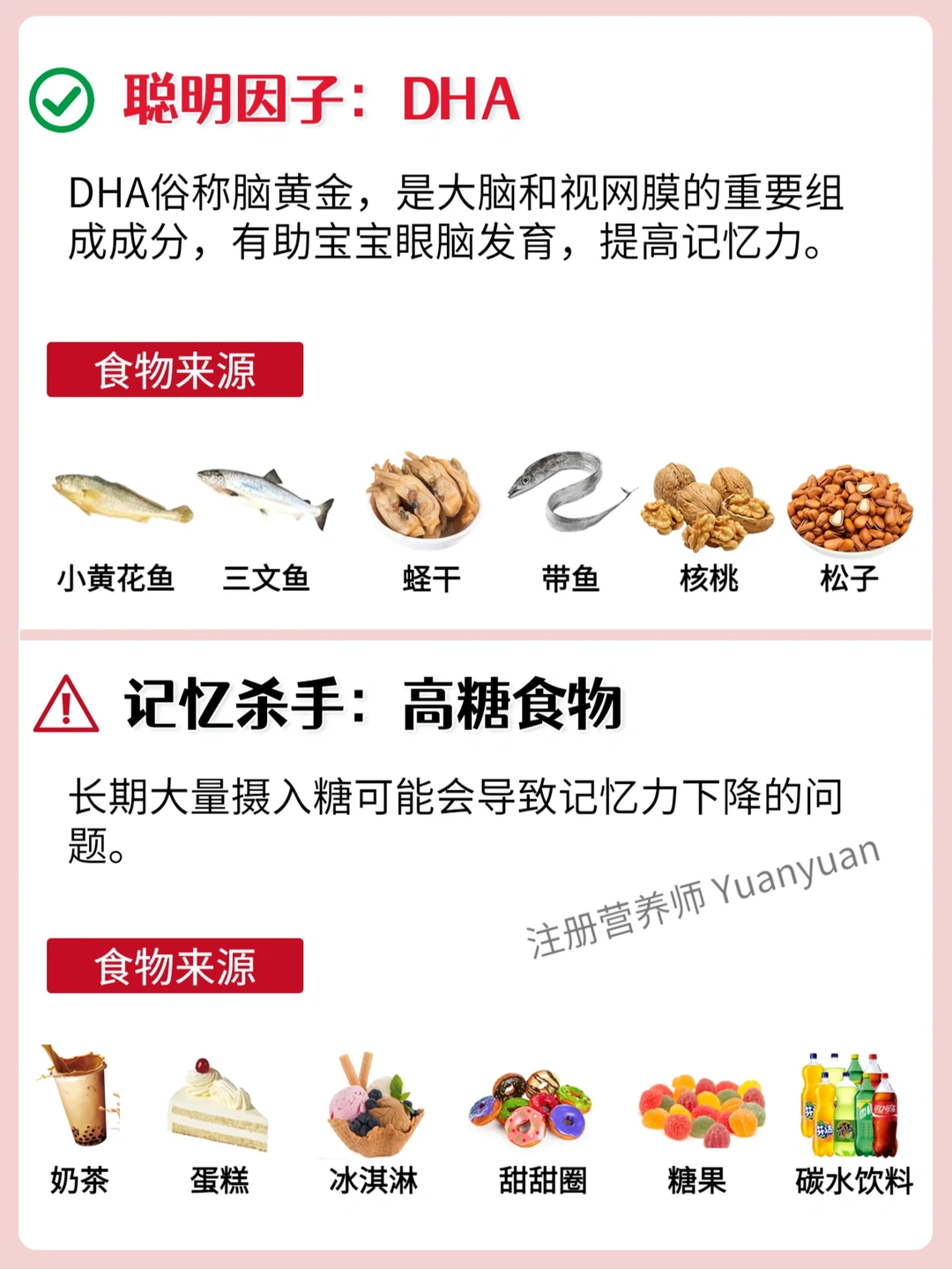 🔺聪明因子:DHA。食物来源:深海鱼、坚果。