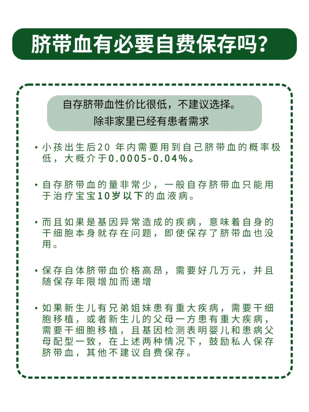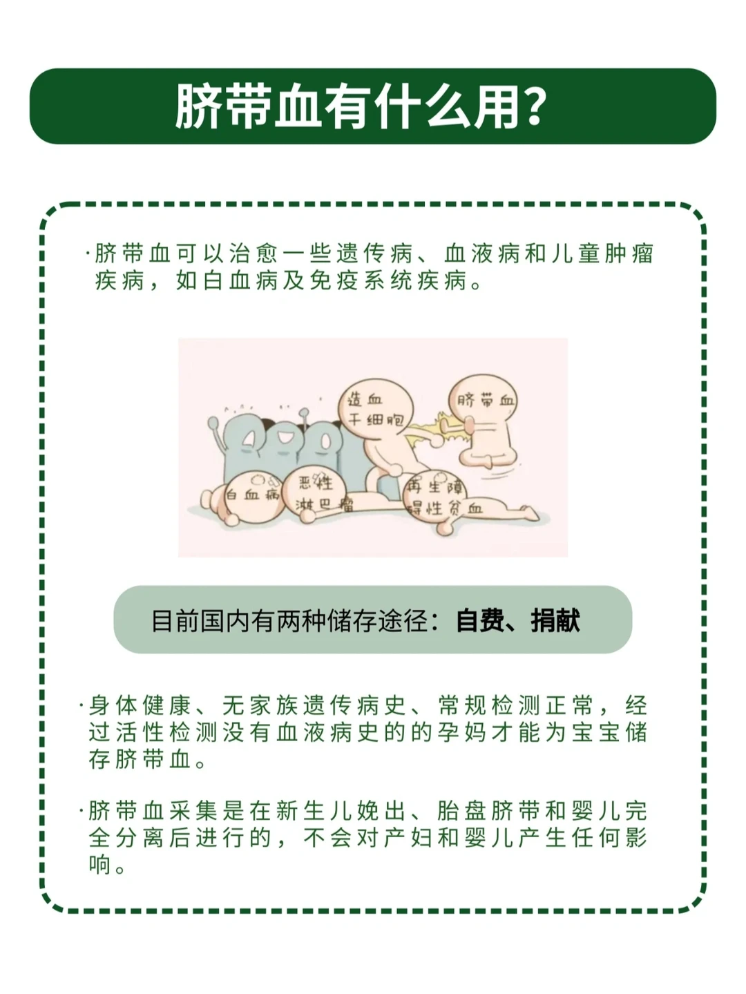 准妈妈应该都听说和考虑过“存脐带血”,就是把新生儿的脐带血收藏着,以后只有这个婴儿或家人有权使用。这个项目费用不菲,不仅有几千上万的脐带血收集费用,每年还需要交纳数百乃至上千的保存费用。 虽然有点贵,但是宣传单看起来实在很有吸引力: 📃“脐带血可以Z很多病” 📃“存储脐带血一生只有一次,错过了就再无机会!” 这种从科学到感情的360˚ 立体式宣传,让新鲜出炉的父母难以拒绝。 那么脐带血到底有没有必要自费保存呢? 花1分钟时间了解清楚,脐带血储存的作用及用途,用到的概率。