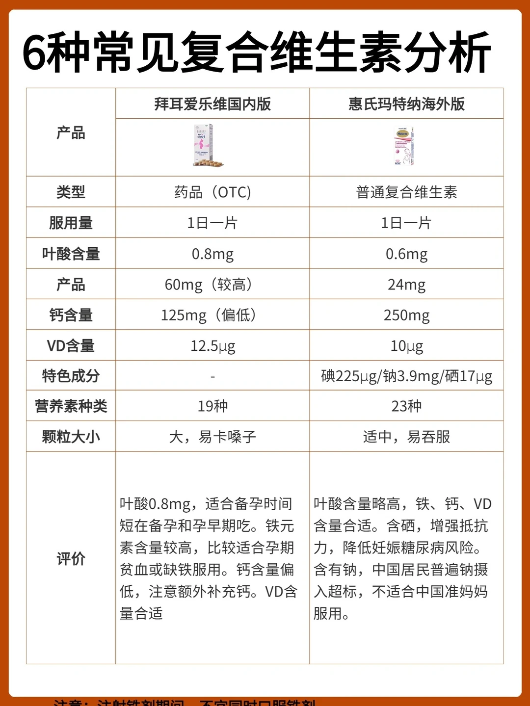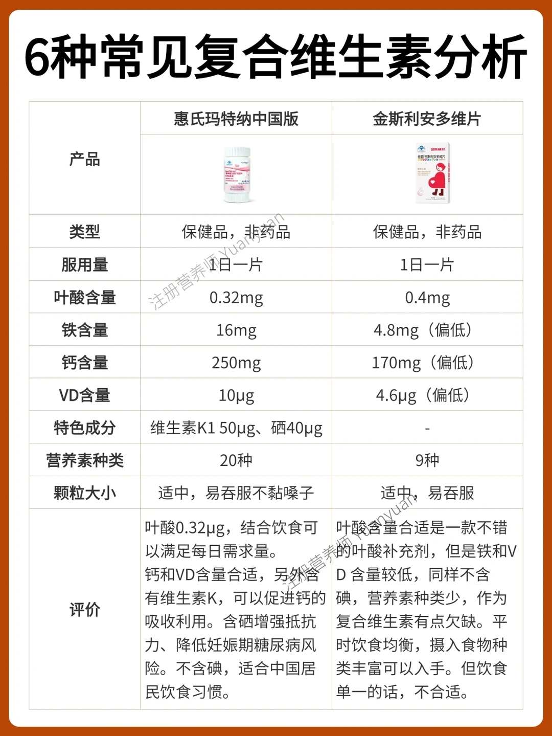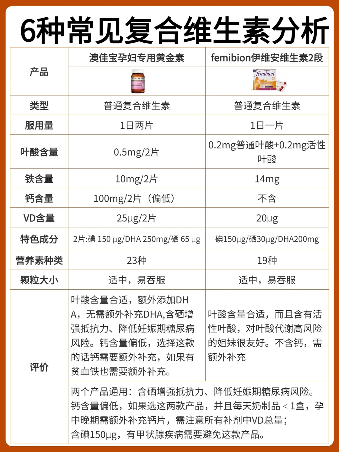 备孕和孕期的营养至关重要。复合维生素是大多数人的选择。市面上的复合维生素这么多?怎么选呢? ⭐️其实作为备孕期和孕期复合维生素有基本的挑选原则 ①营养素种类:重点营养素(叶酸、铁、钙、维生素D)要有。 ②营养素含量:重点营养素含量要适中,不过多,不太少。 ⭐️从营养师角度,分析了市面上常见的6个品牌复合维生素,并基于自己专业营养知识给出了个人建议。大家可以基于图文分析选择合适自己的复合维生素,也可以根据分析思路分析其他产品。