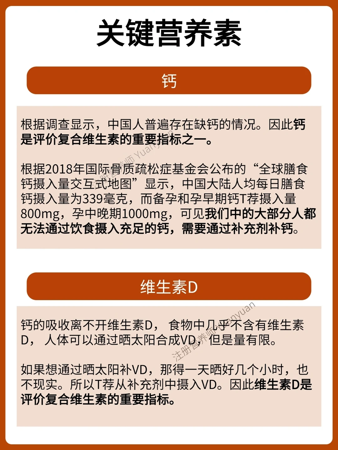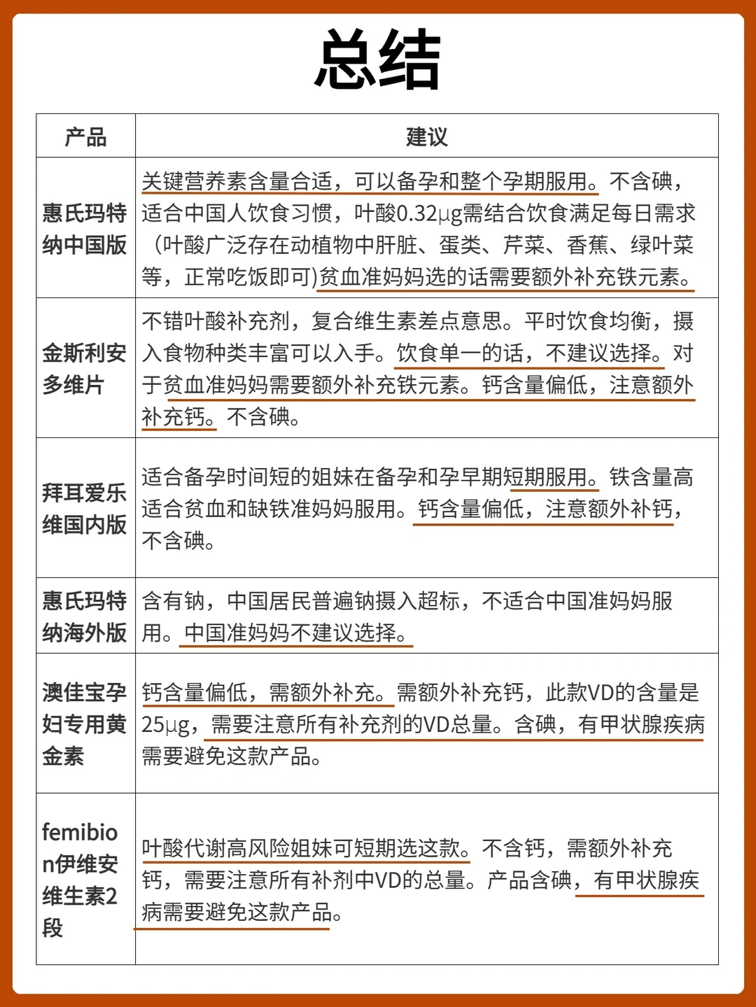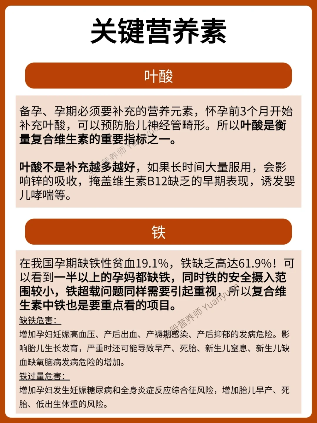 备孕和孕期的营养至关重要。复合维生素是大多数人的选择。市面上的复合维生素这么多?怎么选呢? ⭐️其实作为备孕期和孕期复合维生素有基本的挑选原则 ①营养素种类:重点营养素(叶酸、铁、钙、维生素D)要有。 ②营养素含量:重点营养素含量要适中,不过多,不太少。 ⭐️从营养师角度,分析了市面上常见的6个品牌复合维生素,并基于自己专业营养知识给出了个人建议。大家可以基于图文分析选择合适自己的复合维生素,也可以根据分析思路分析其他产品。
