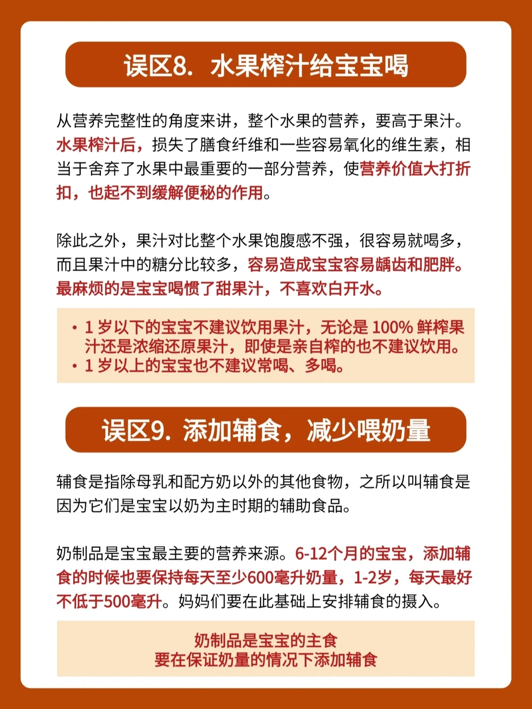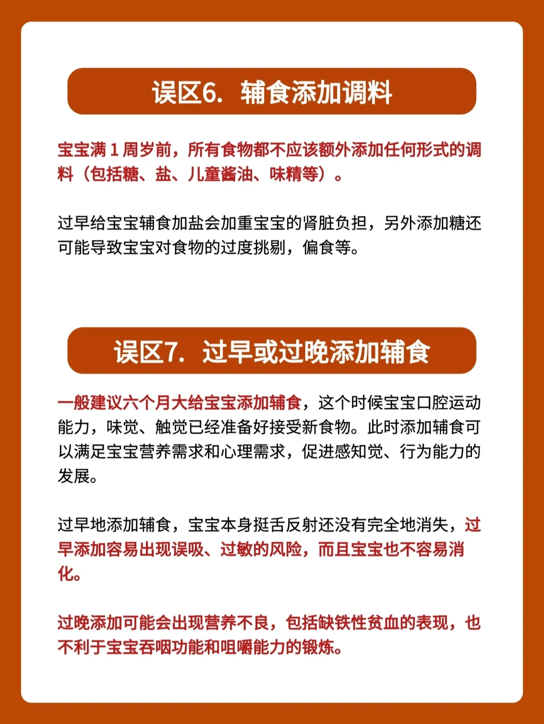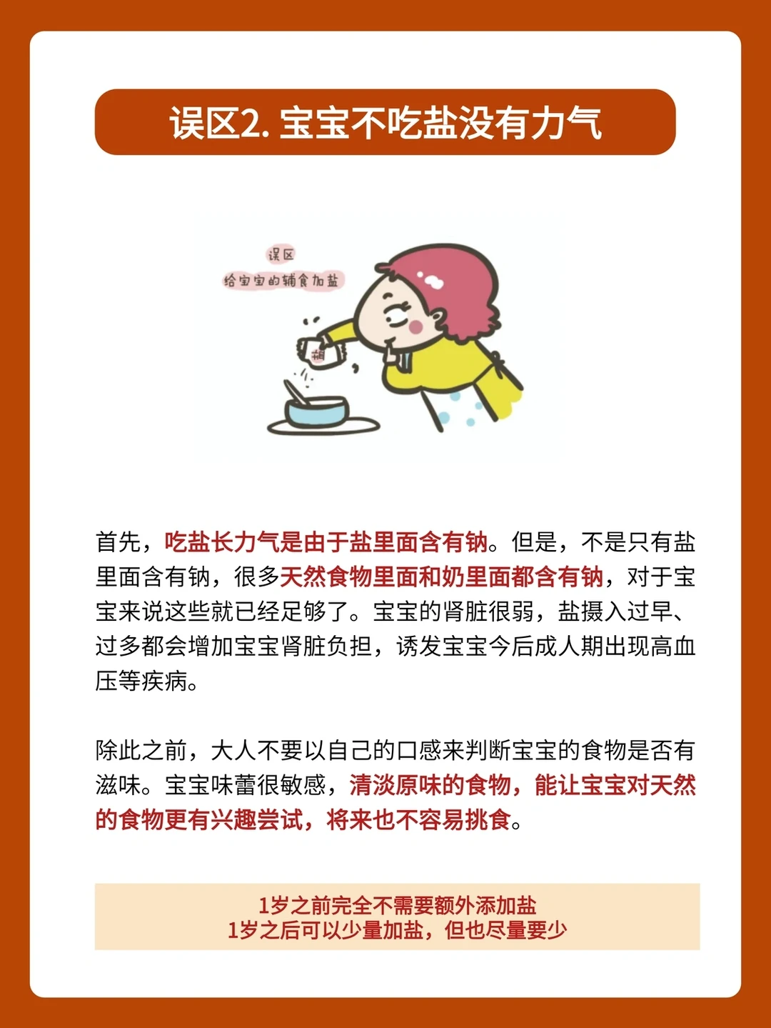 对于宝宝辅食添加,新手爸妈常会陷入几个误区。看看你中招了没? ‼️误区‼️ 1⃣宝宝不能吃油 2⃣宝宝不吃盐没有力气 3⃣太早吃肉,宝宝消化不了 4⃣自制米粉更健康更天然 5⃣宝宝没有牙,辅食越碎越好 6⃣添加辅食,减少喂奶量 7⃣过早或过晚添加辅食 8⃣水果榨汁给宝宝喝 9⃣辅食添加调料 一起来解锁养娃知识,为迎接更美好的生活做准备!