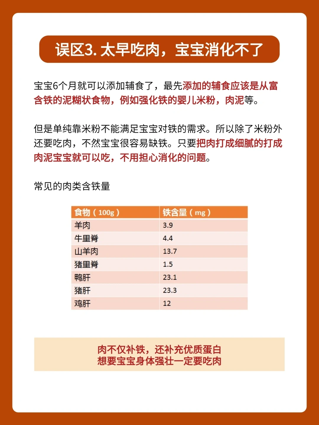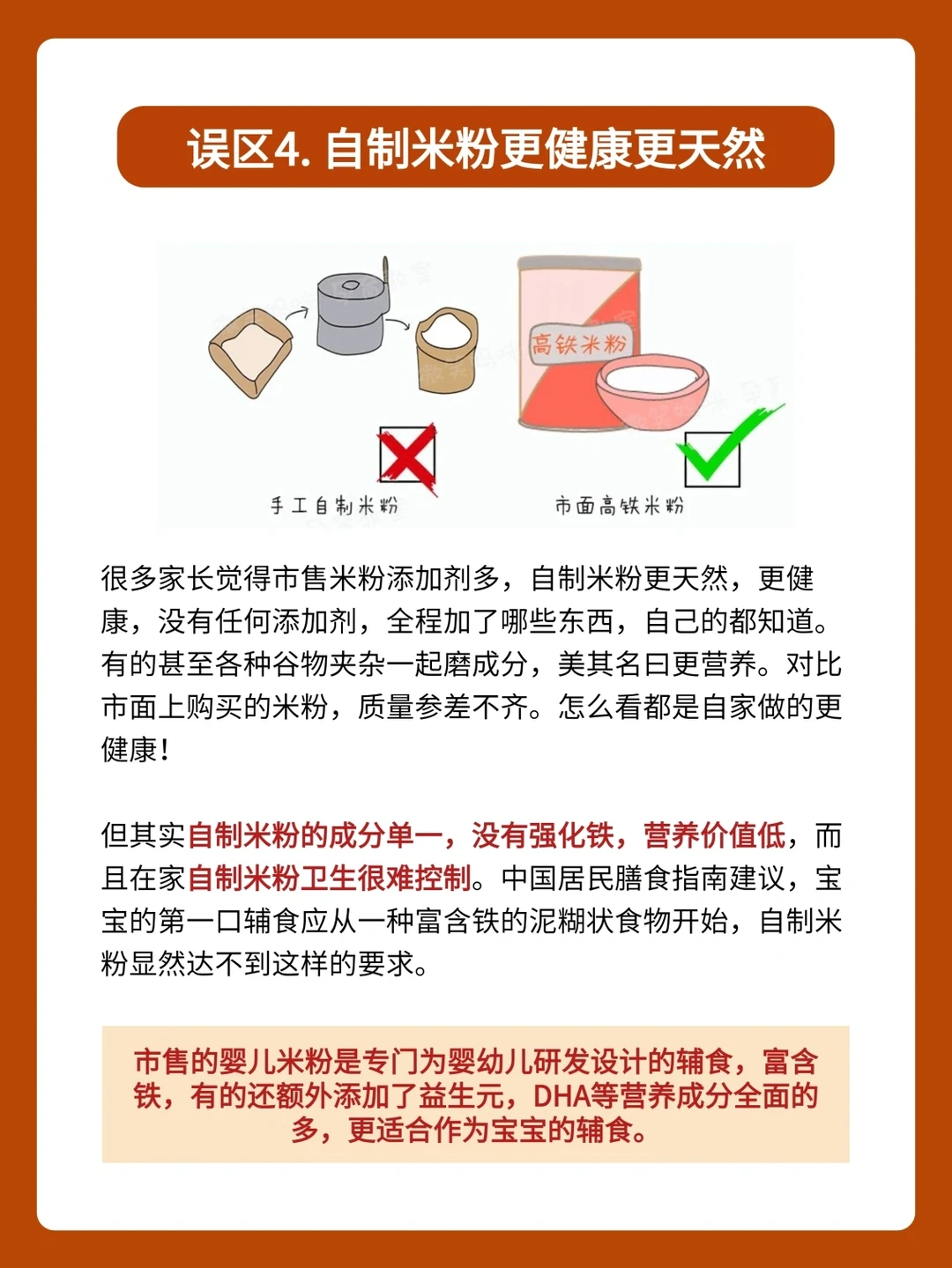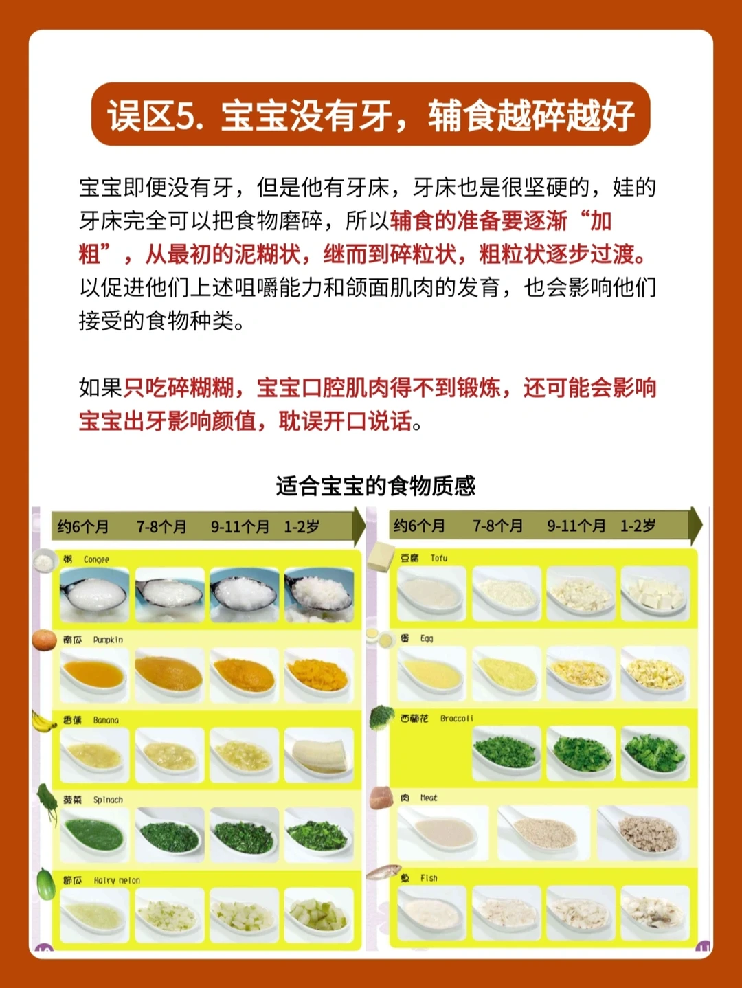 对于宝宝辅食添加,新手爸妈常会陷入几个误区。看看你中招了没? ‼️误区‼️ 1⃣宝宝不能吃油 2⃣宝宝不吃盐没有力气 3⃣太早吃肉,宝宝消化不了 4⃣自制米粉更健康更天然 5⃣宝宝没有牙,辅食越碎越好 6⃣添加辅食,减少喂奶量 7⃣过早或过晚添加辅食 8⃣水果榨汁给宝宝喝 9⃣辅食添加调料 一起来解锁养娃知识,为迎接更美好的生活做准备!