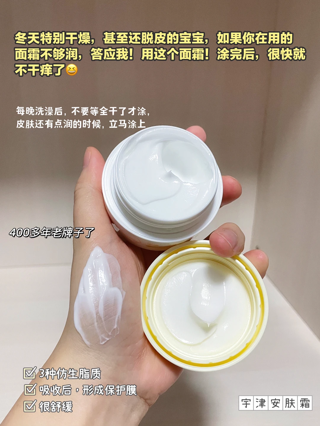 2️⃣面霜:滋润肌肤,涂完后就不干痒,推荐宇津面霜,用过4、5个面霜,皮肤特别干的时候用这个安肤霜,肤感润而不油,很适合新生儿,每天早晚涂~