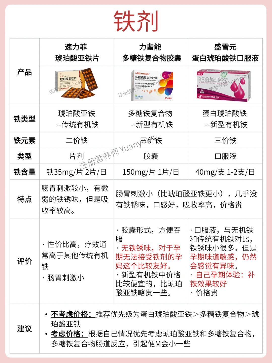 🔺铁剂:速力菲 琥珀酸亚铁片、力蜚能 多糖铁复合物胶囊、盛雪元 蛋白琥珀酸铁口服液