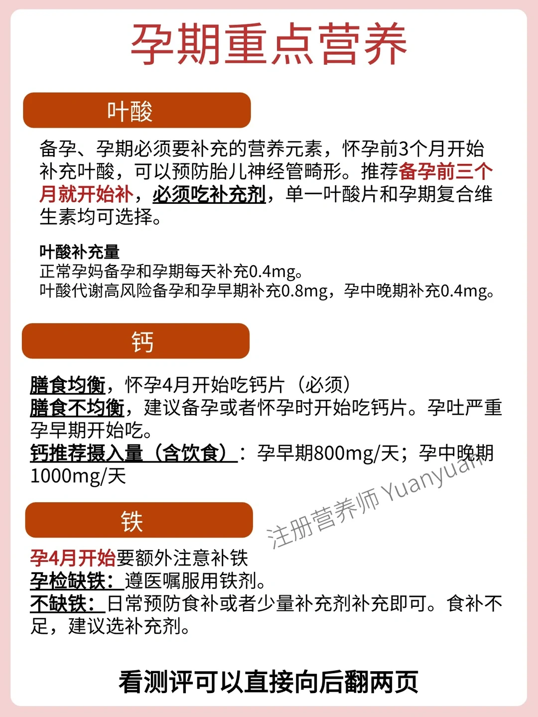 🔺叶酸:怀孕前3个月开始补充,必须吃补充剂,建议整个孕期都补充,单一叶酸片和复合维生素都可以选择。