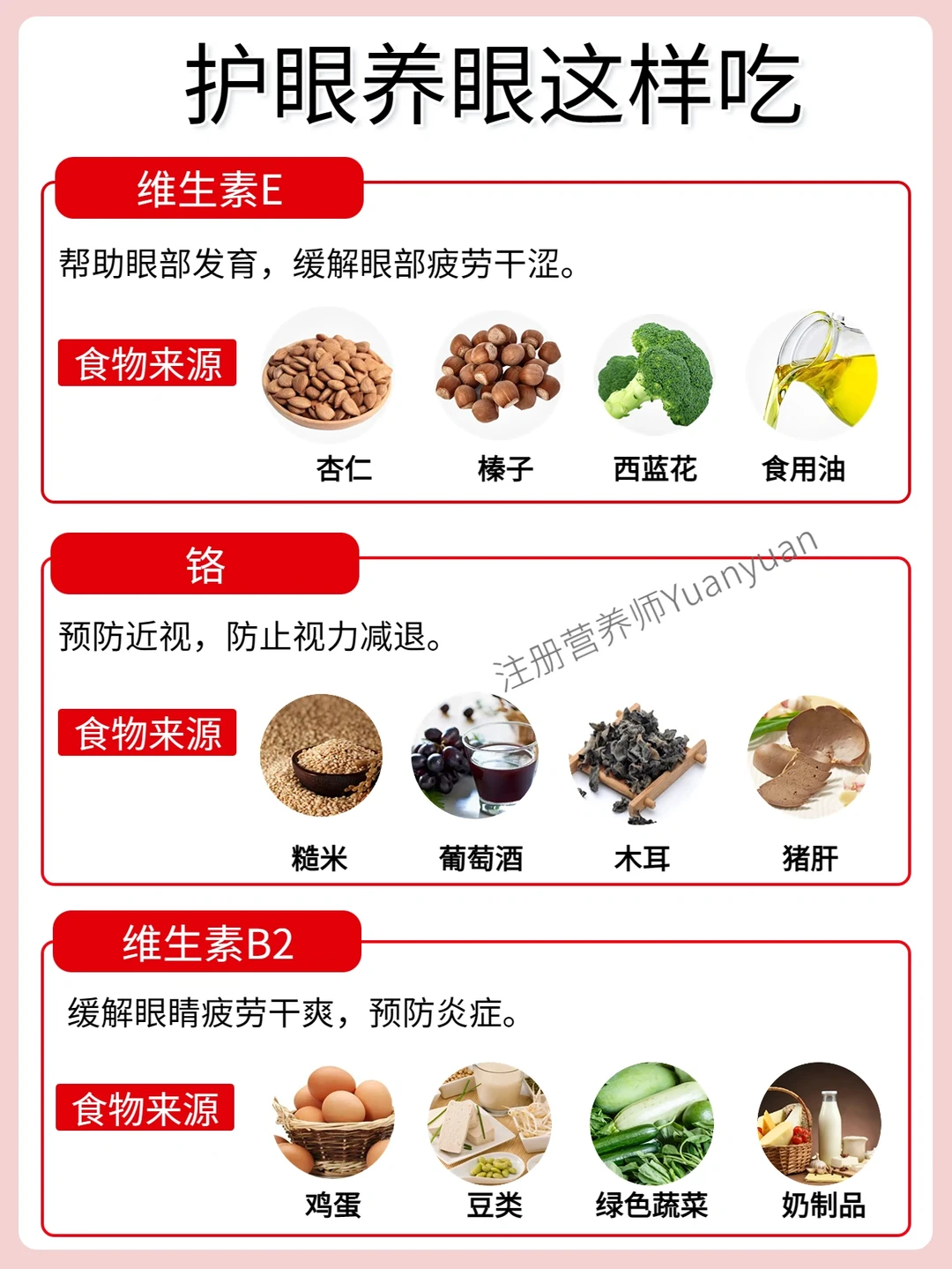 🔺维生素A:构成眼睛感光物质的重要原料,保护视力,预防夜盲症;