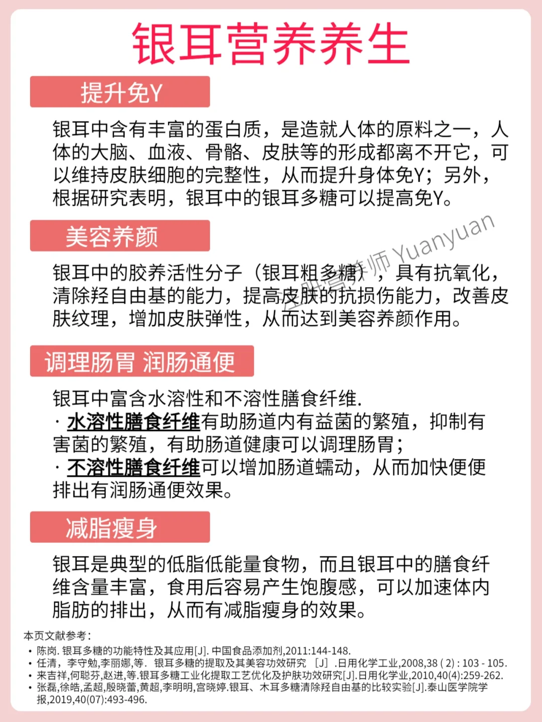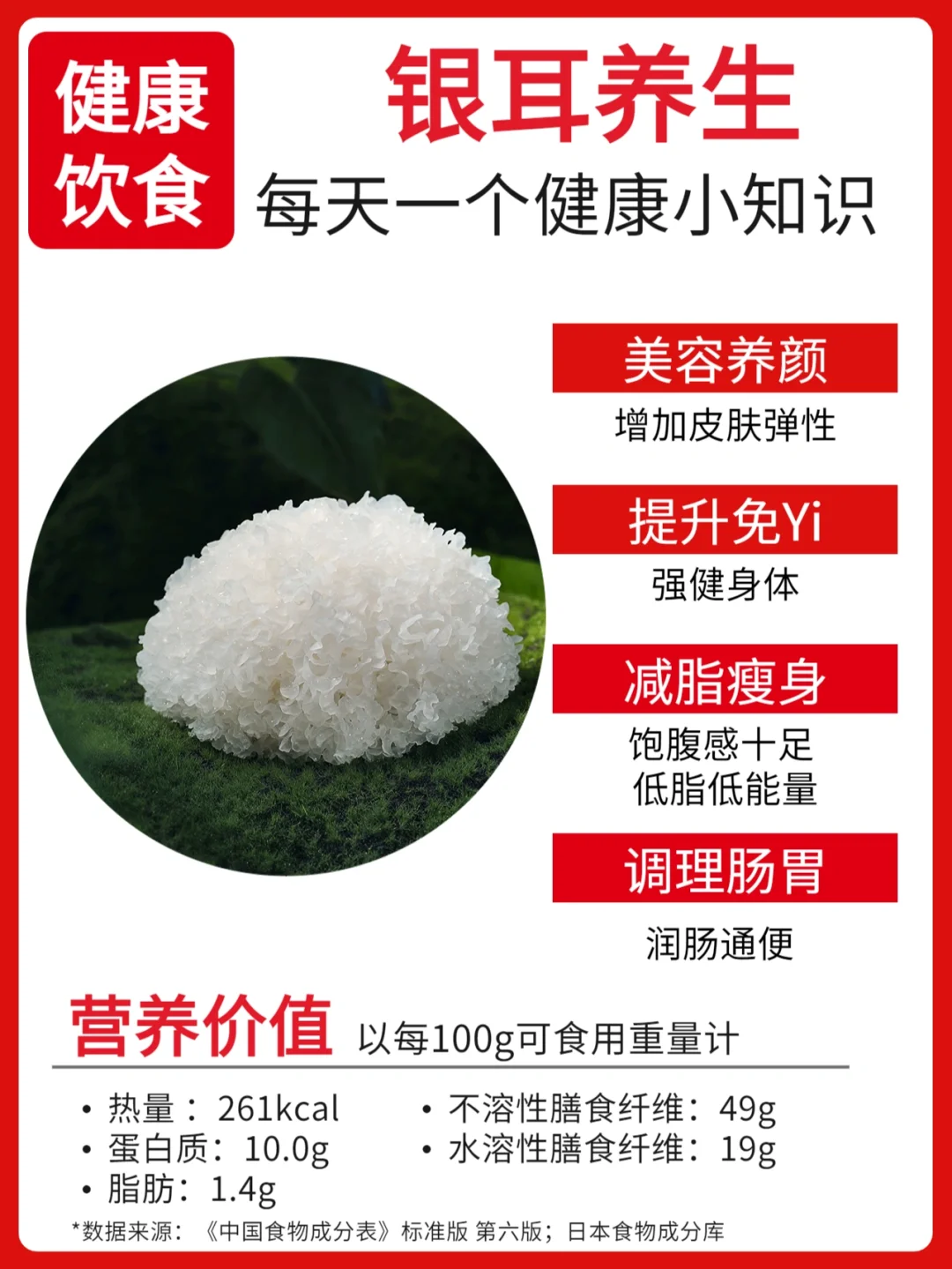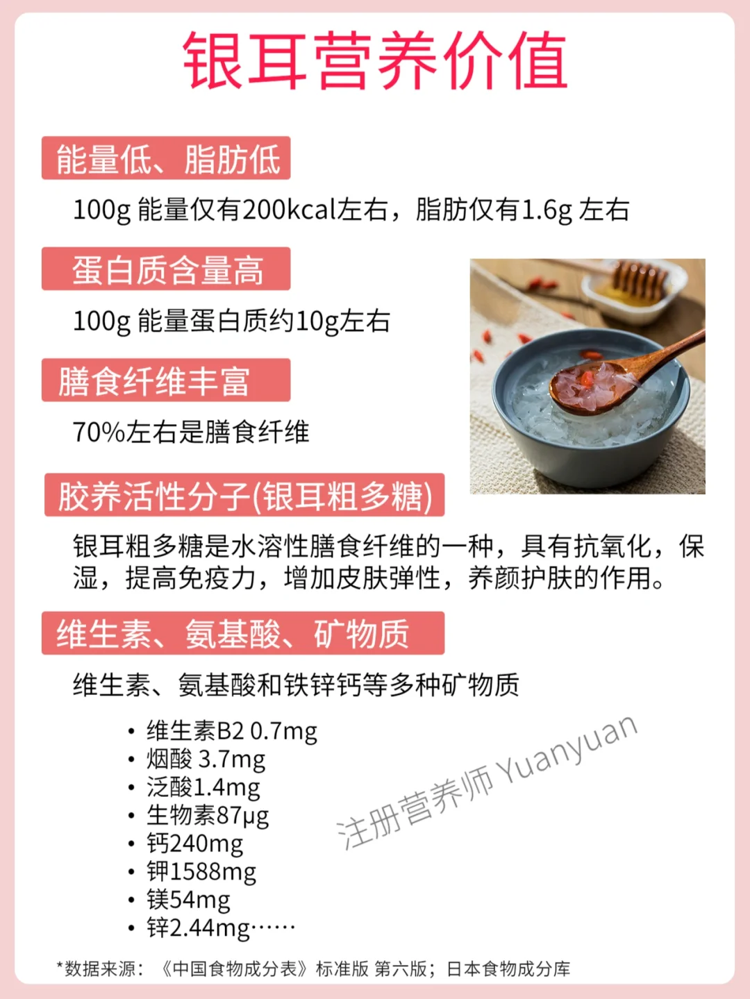 👉银耳是我国比较传统的养生食物,有增加皮肤弹性,美容养颜,提高免Y,调理肠胃,润肠通B的作用。而且它是典型的低能低脂,高膳食纤维(70%左右)食物,减脂期也可放心吃。