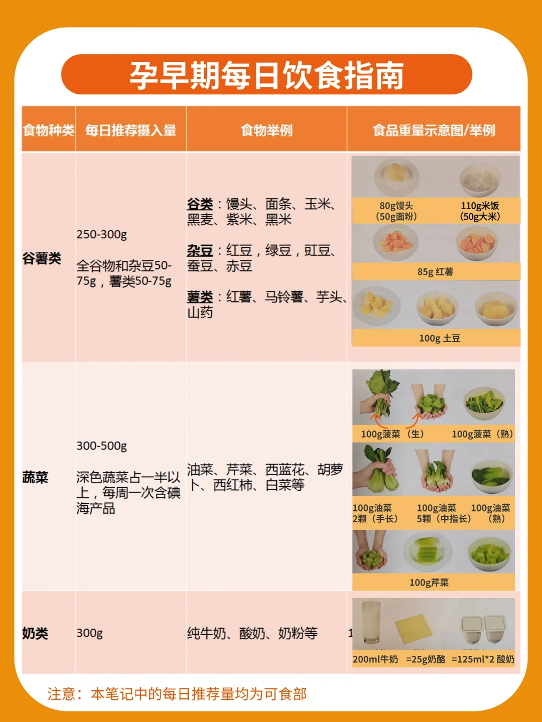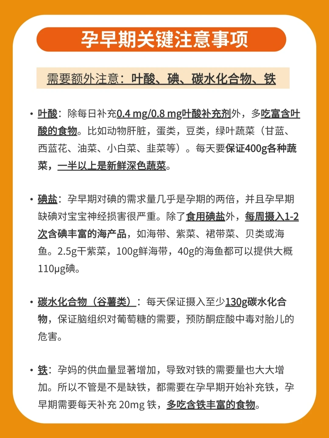 孕早期饮食需要注意:补充叶酸,食用碘盐,碳水化合物(谷薯类)摄入量,含铁丰富食物
