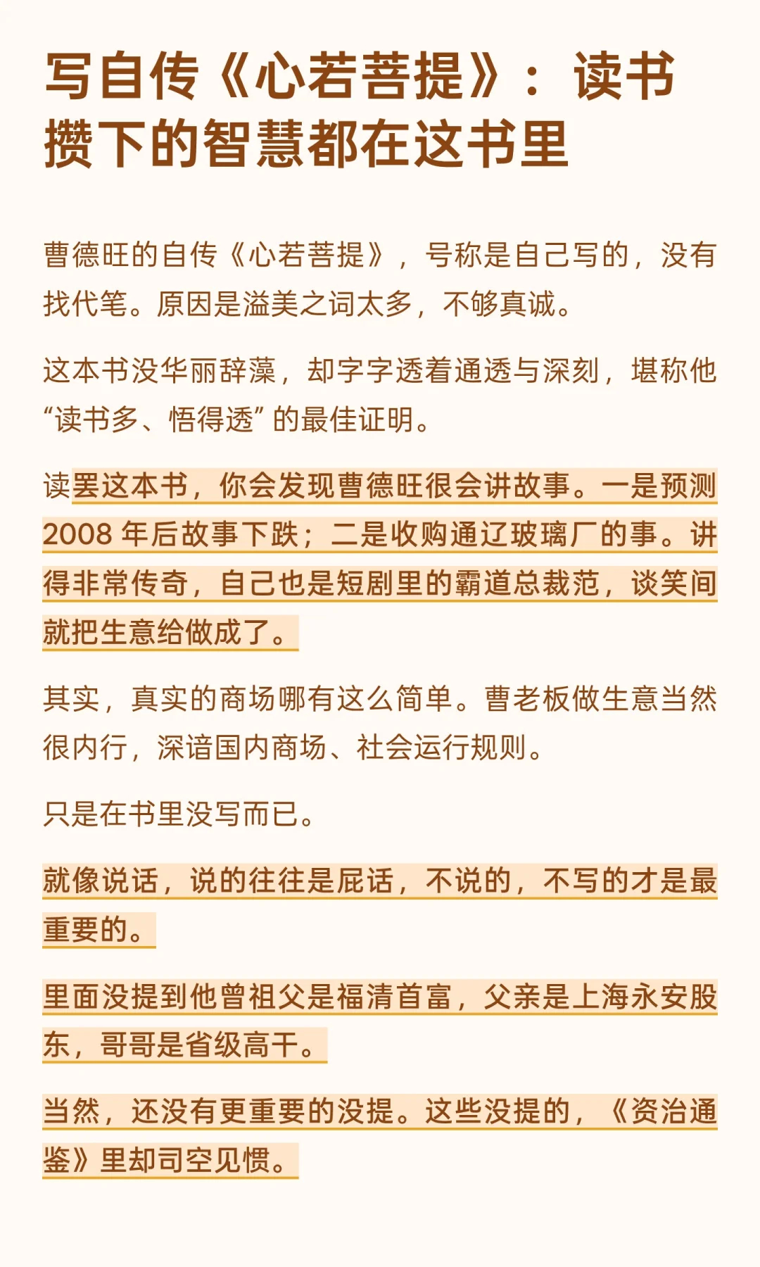 曹德旺的自传《心若菩提》,说是自己写的,没有找代笔。原因是溢美之词太多,不够真诚。