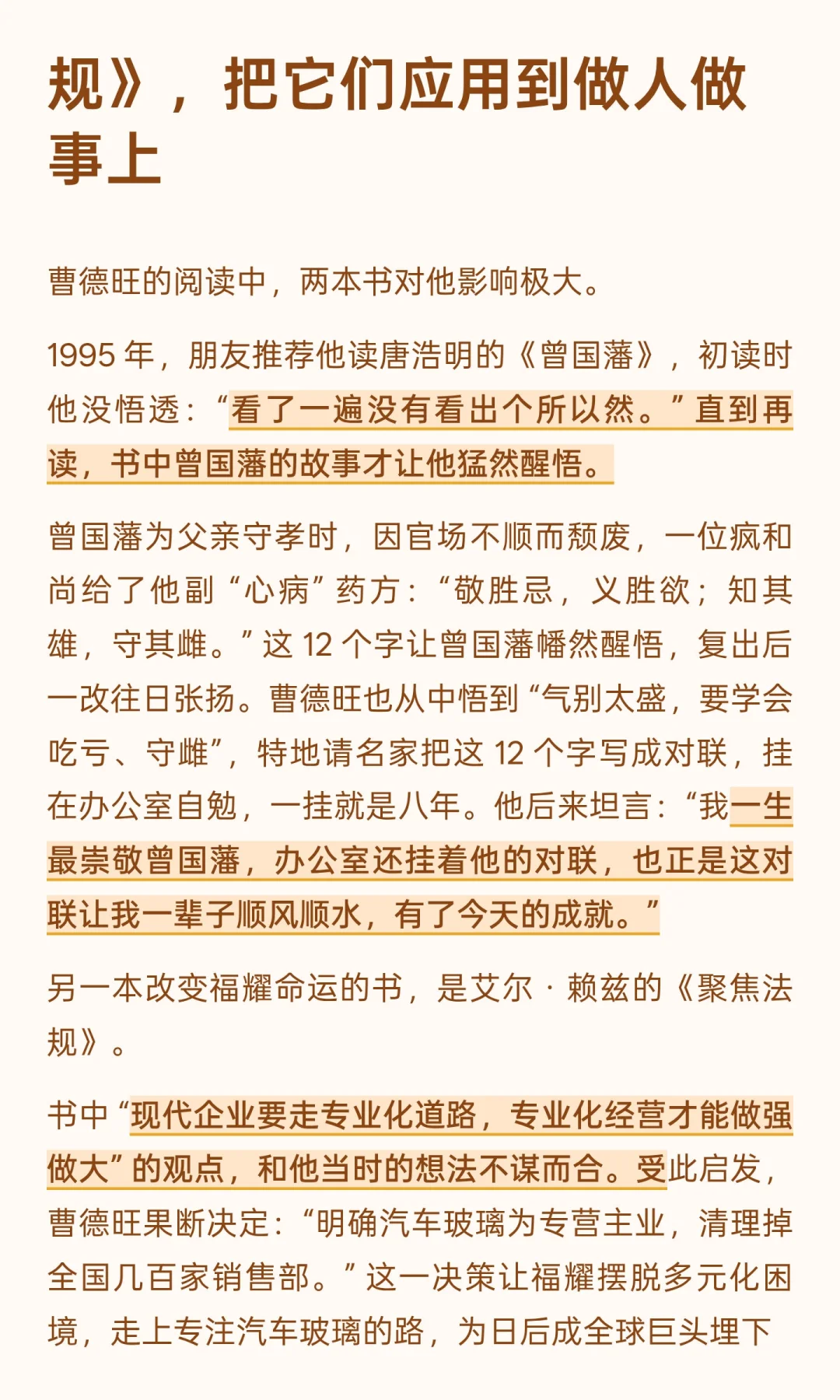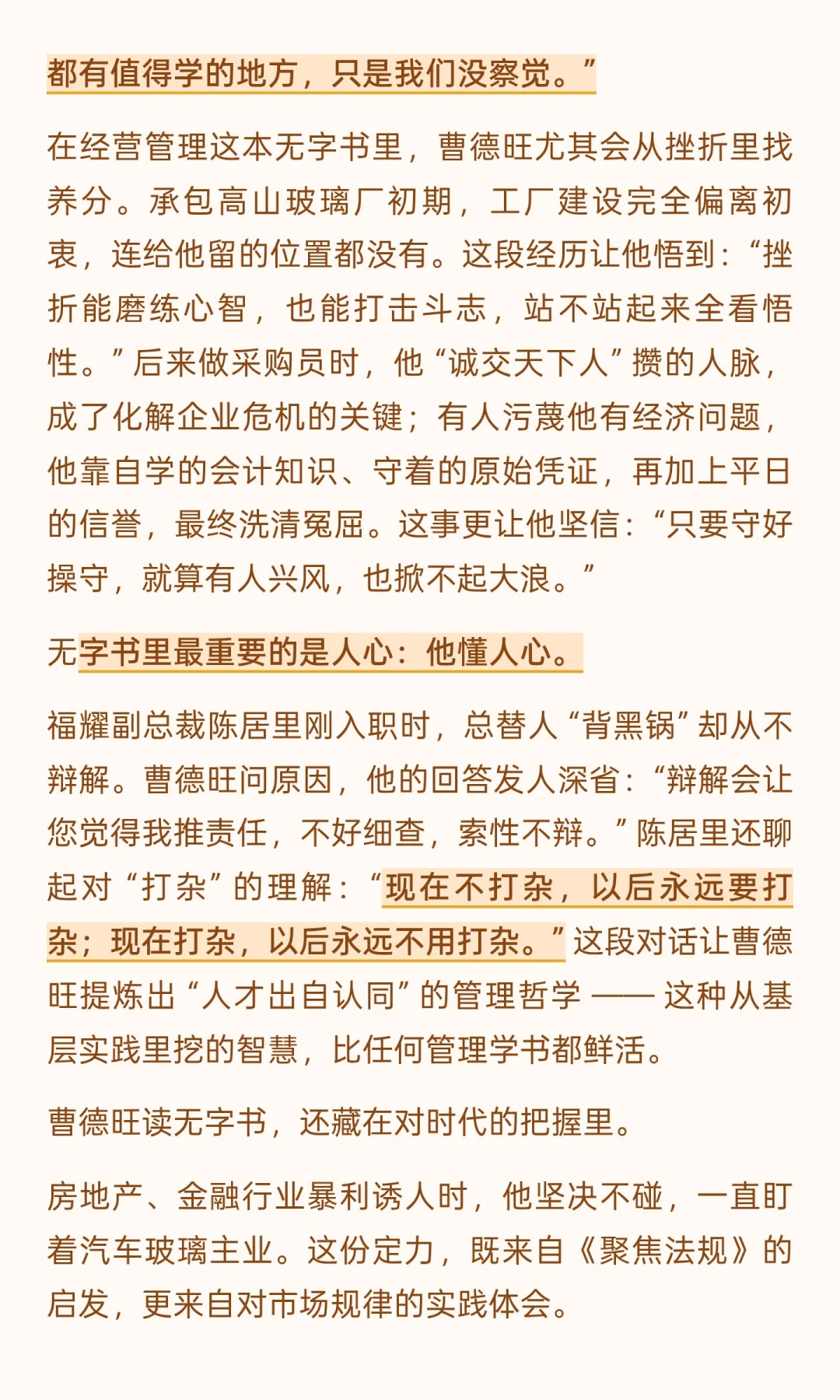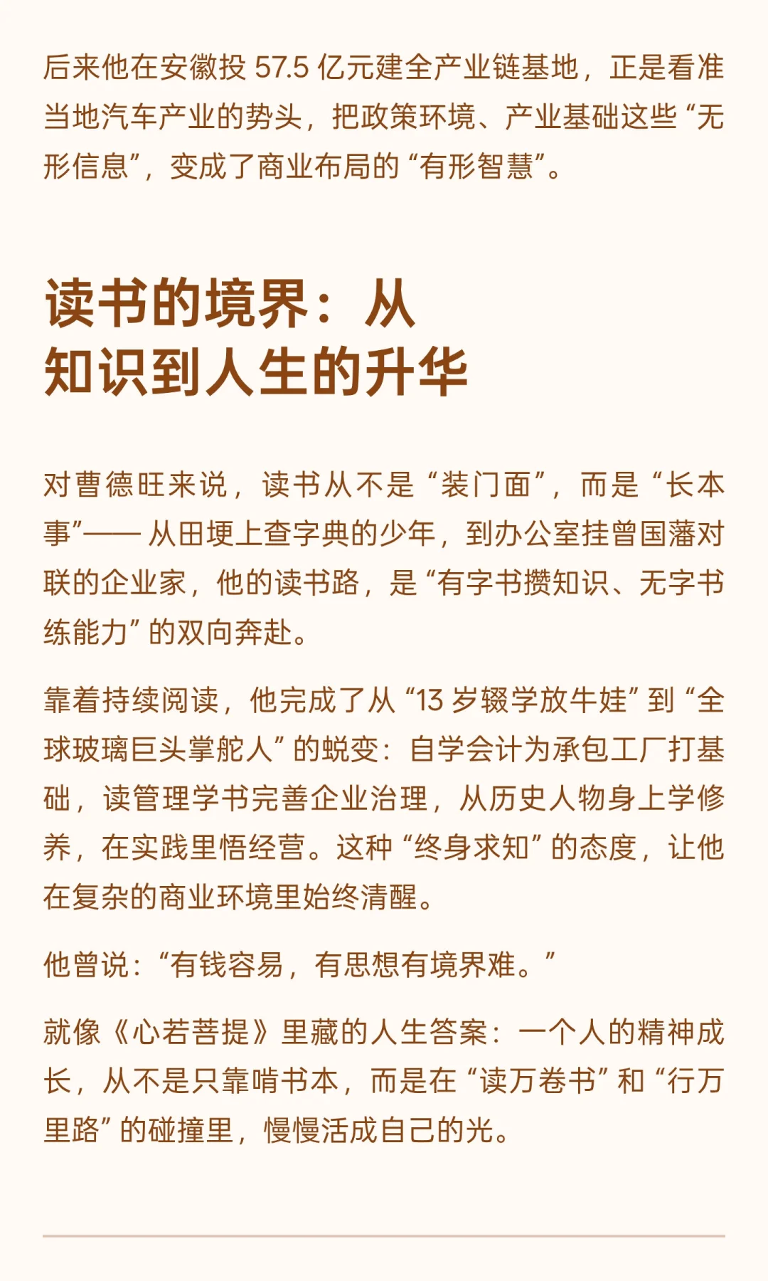 曹德旺很会讲故事。一是预测 2008 年后故事下跌;二是收购通辽玻璃厂的事。讲得非常传奇,自己也是短剧里的霸道总裁范,谈笑间就把生意给做成了。