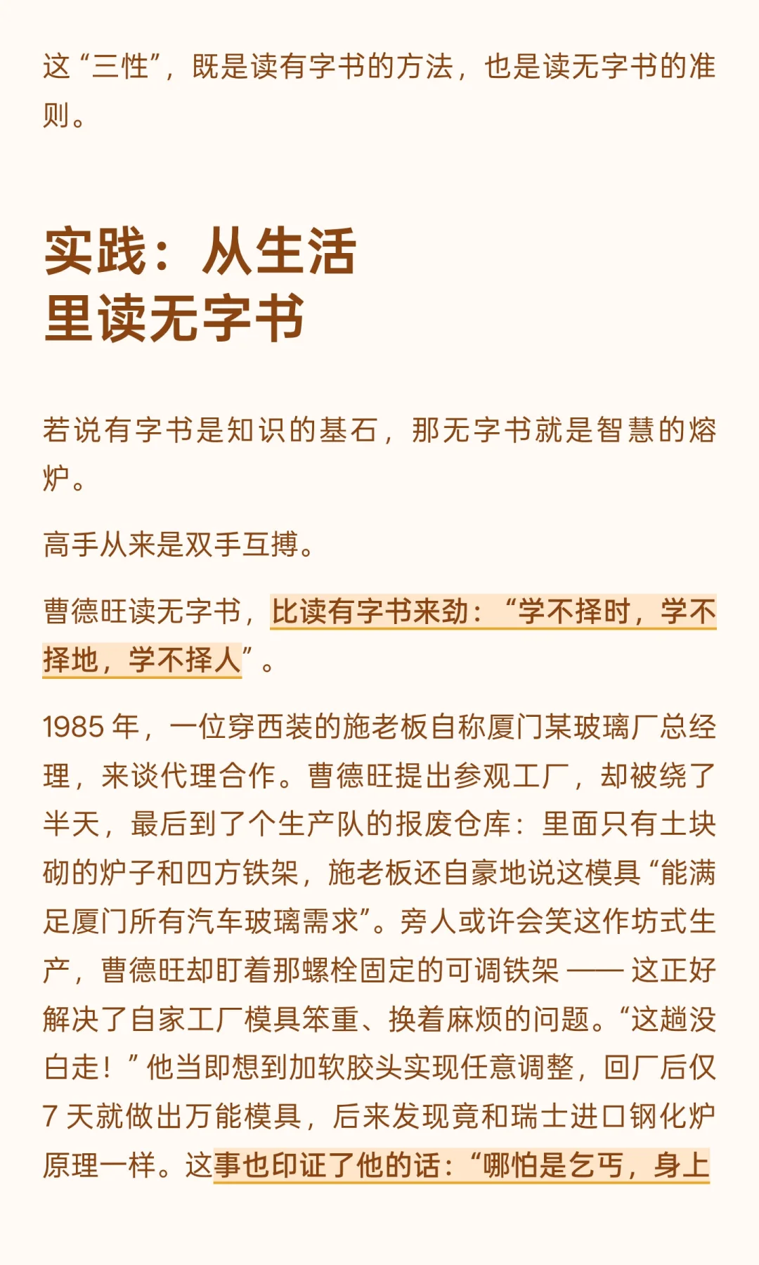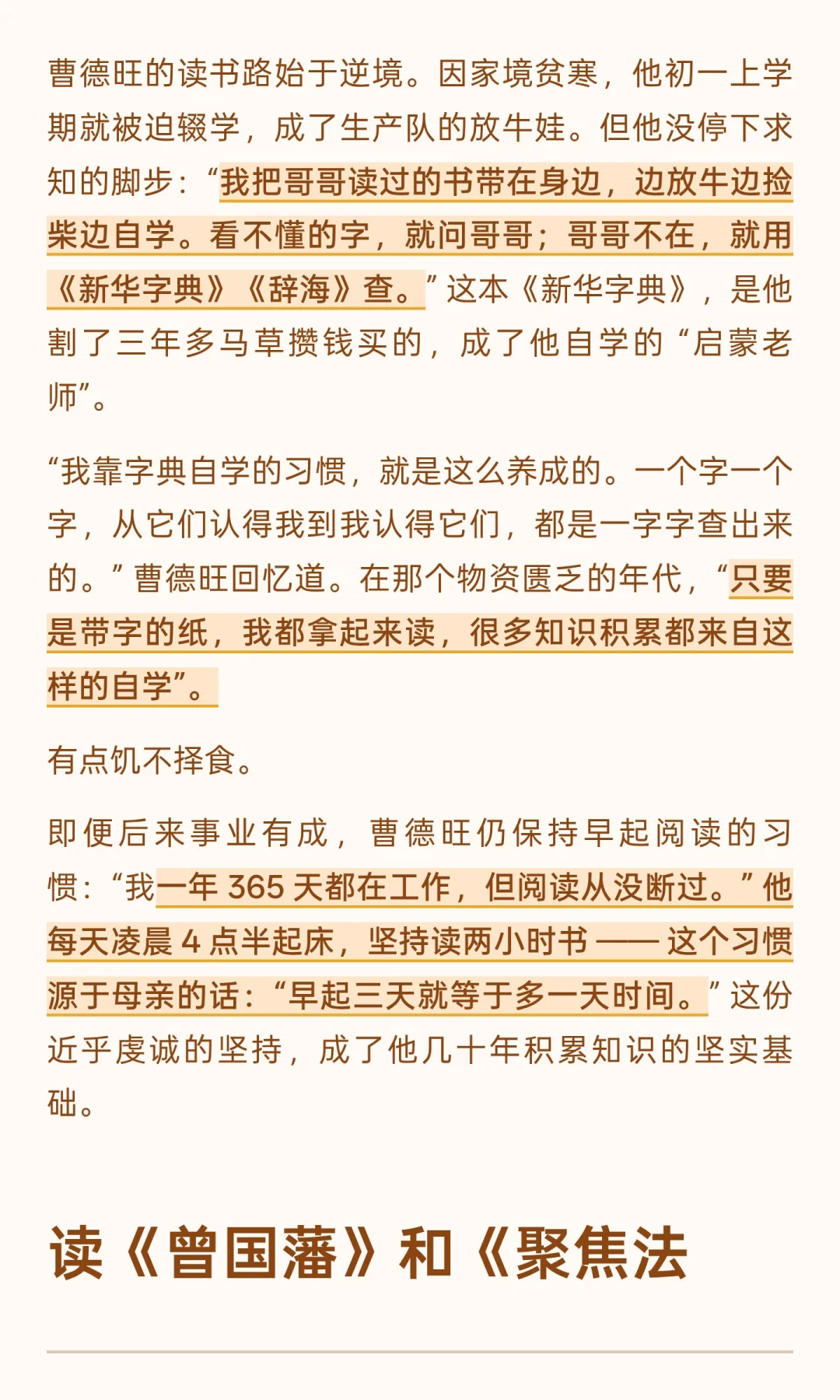 即便后来事业有成,曹德旺仍保持早起阅读的习惯:“我一年 365 天都在工作,但阅读从没断过。” 他每天凌晨 4 点半起床,坚持读两小时书 —— 这个习惯源于母亲的话:“早起三天就等于多一天时间。” 这份近乎虔诚的坚持,成了他几十年积累知识的坚实基础。