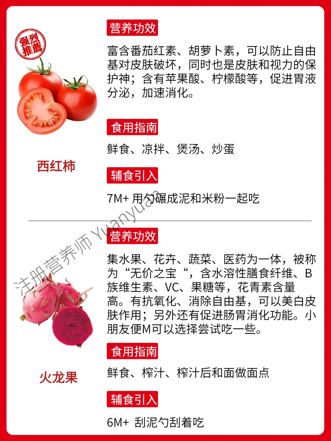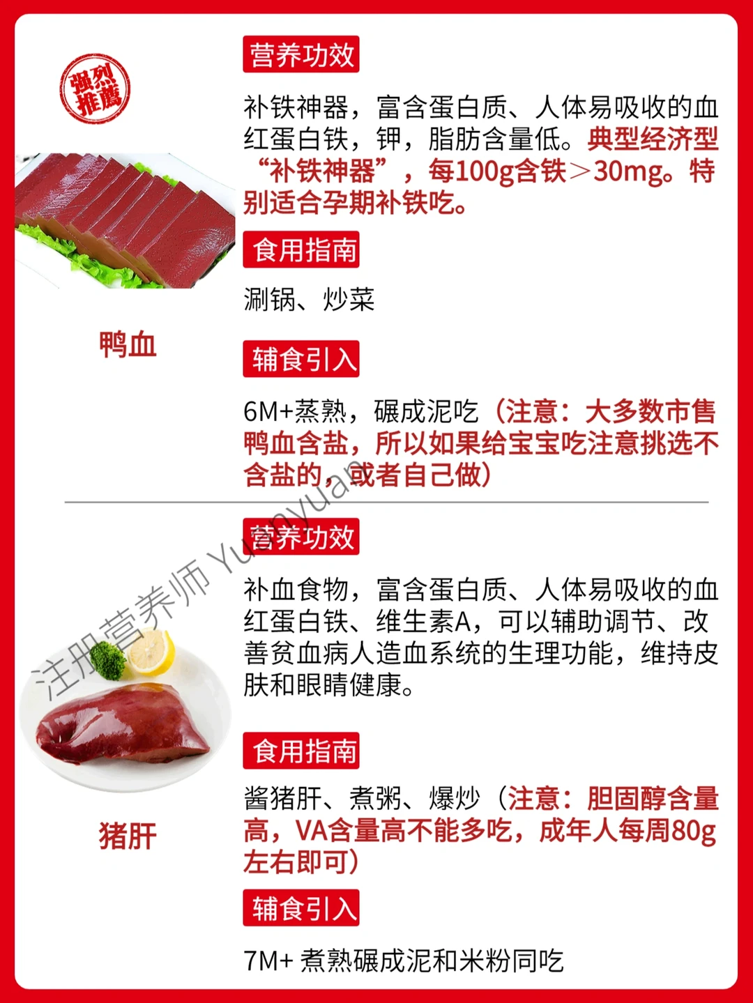 🔺红色食物大多数含铁,尤其是动物性红色食物,富含血红蛋白铁,好X收,有预防缺铁和缓解疲劳的作用,刚刚添加辅食的宝宝和孕期准妈妈们要适当多吃