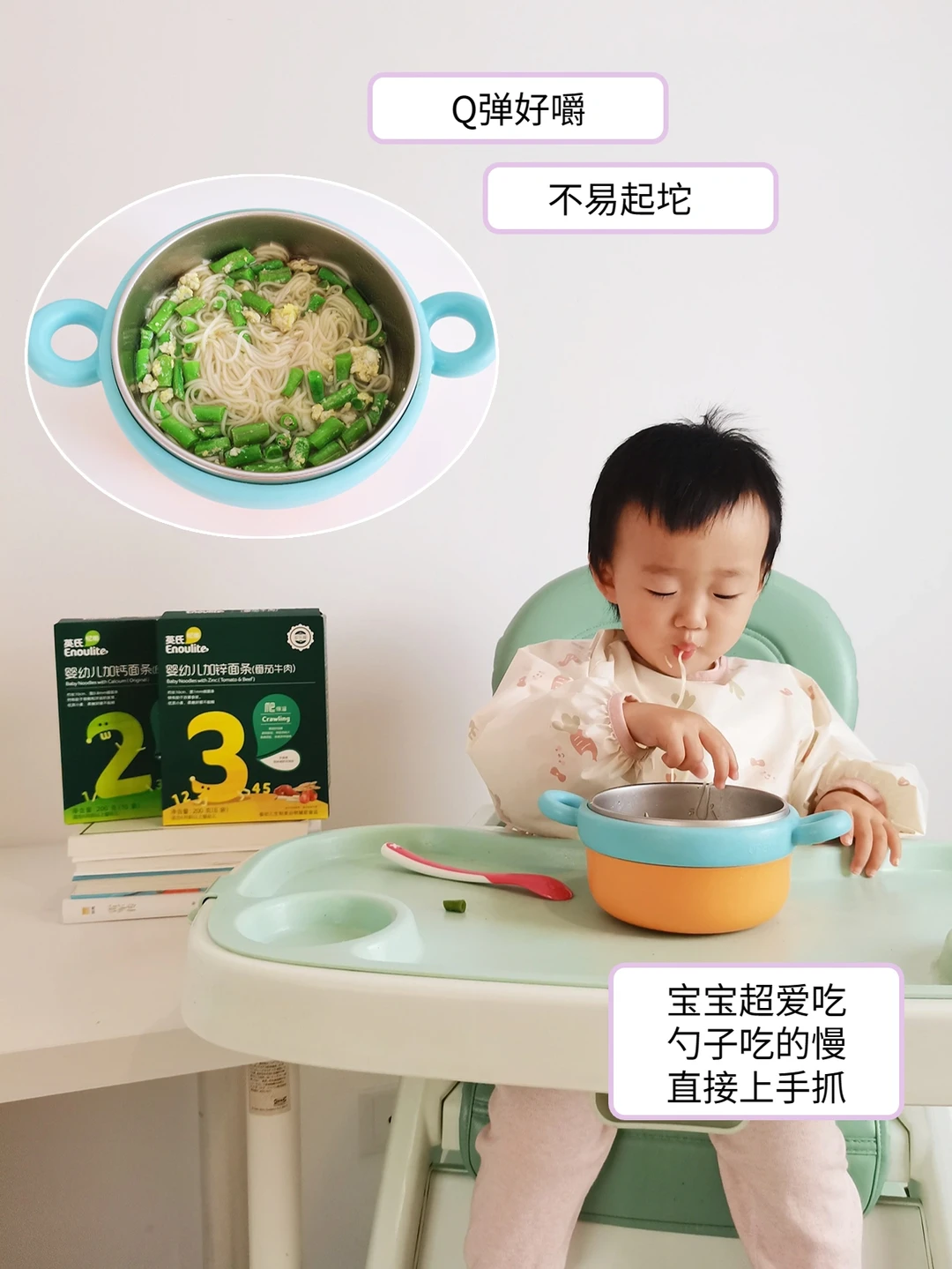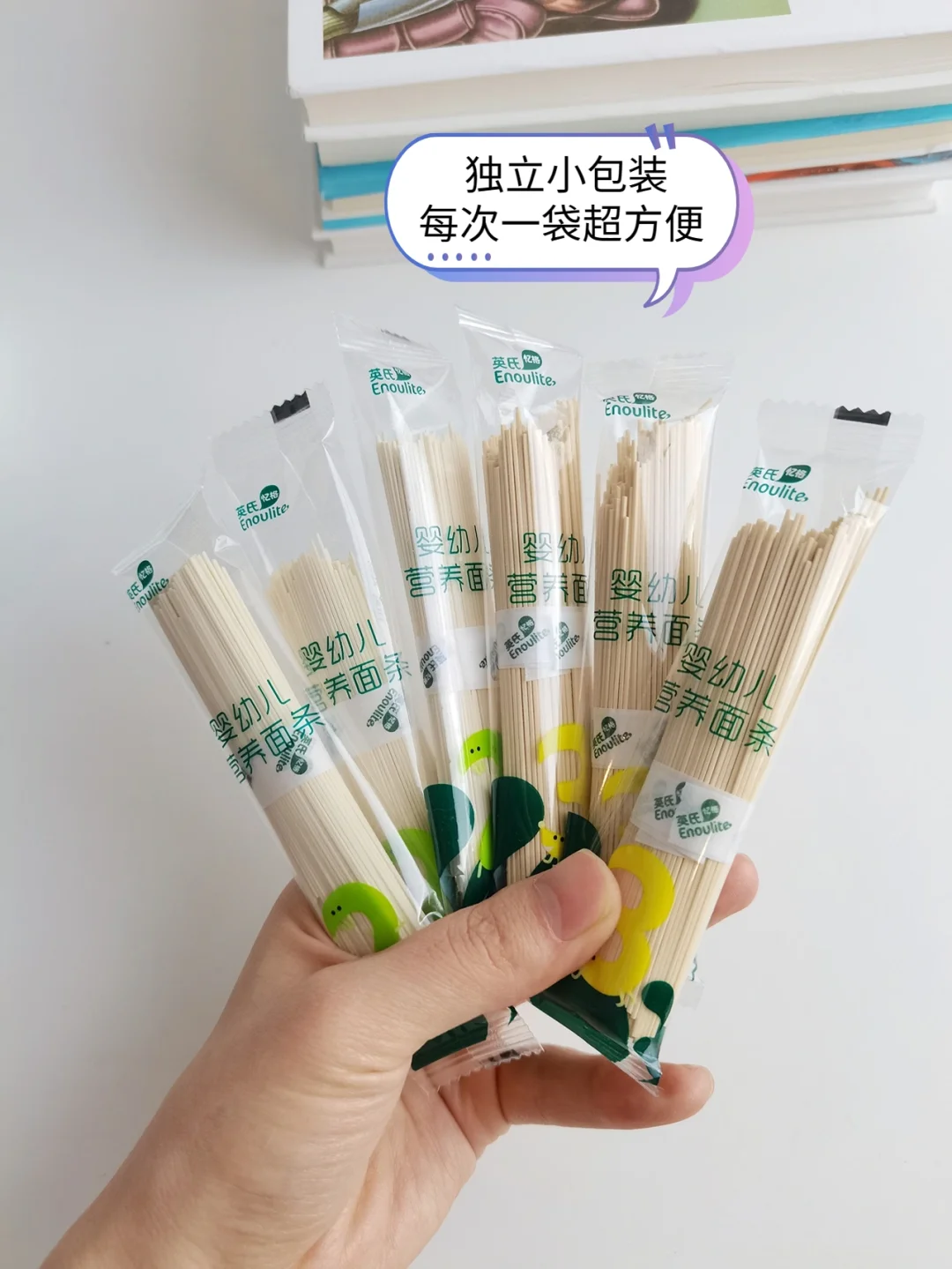 英氏面条3-4分钟就可以煮熟,而且根根分明,不起坨,有嚼劲,我家娃非常爱吃,每次都是1包吃的光光的。符合婴标的宝宝面条都是不添加盐、香精、色素的配料表很干净,小袋子独立包装,一次一包,简单方便,而且还有多种口味可以选择呢💕~
